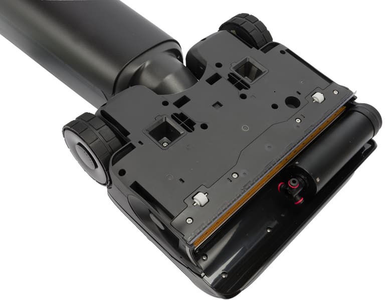 При работе пылесос опирается на два больших моторизованных колеса с резиновыми протекторами. Вращающаяся щетка помогает устройству двигаться вперед, а раздельный привод включается при движении в обратном направлении и поворотах: это компенсирует эффект щетки и снижает до минимума усилие при уборке. Плавности скольжения способствуют два небольших дополнительных роликовых элемента в передней части.