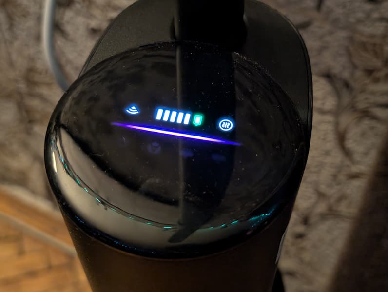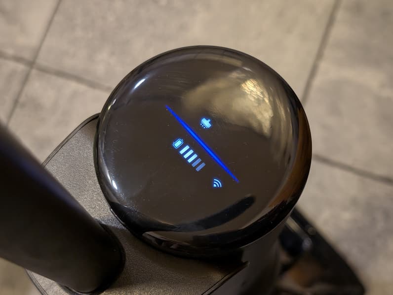 При установке на зарядную станцию на дисплее отображается статус батареи в виде 5-сегментного индикатора. Через некоторое время дисплей гаснет и точное время окончания процесса определить без ватт-метра сложно. Впрочем, пользователю не потребуется пристально следить за готовностью устройства к работе: емкий (4000 мА·ч) аккумулятор позволяет навести в квартире идеальный порядок за один цикл.