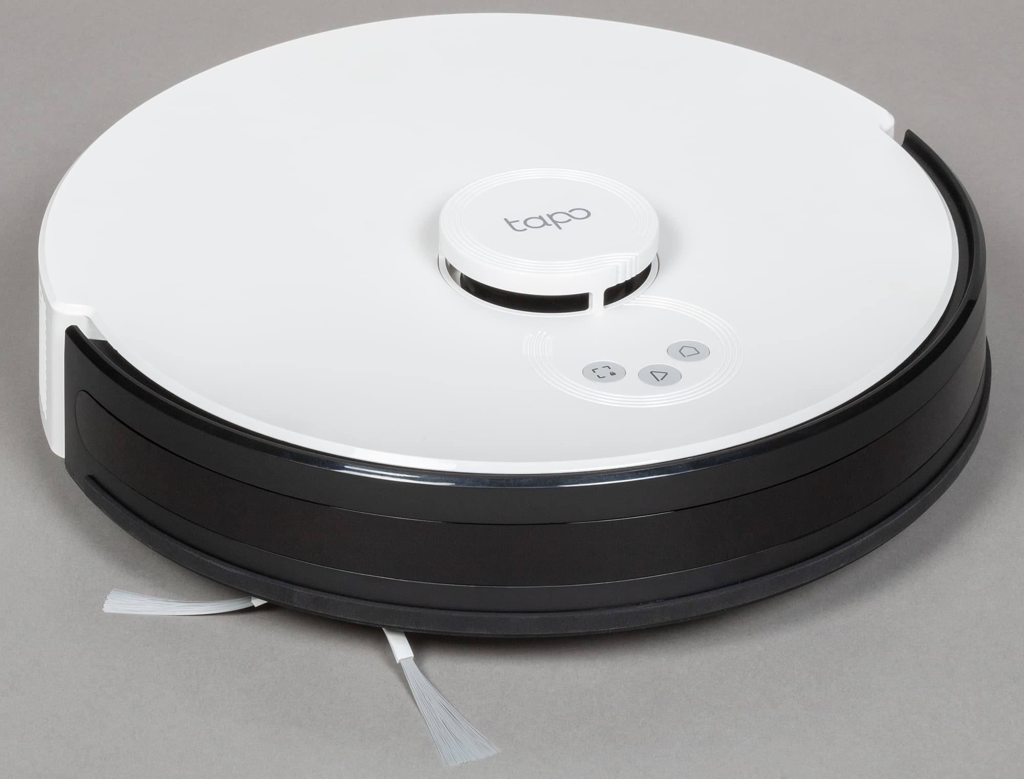 После распаковки перед нами предстал почти что классический робот-пылесос. Форма, как и у большинства подобных устройств, круглая. По центру (чуть со смещением вперед) возвышается башенка лидара, на ней нанесен логотип Tapo.
