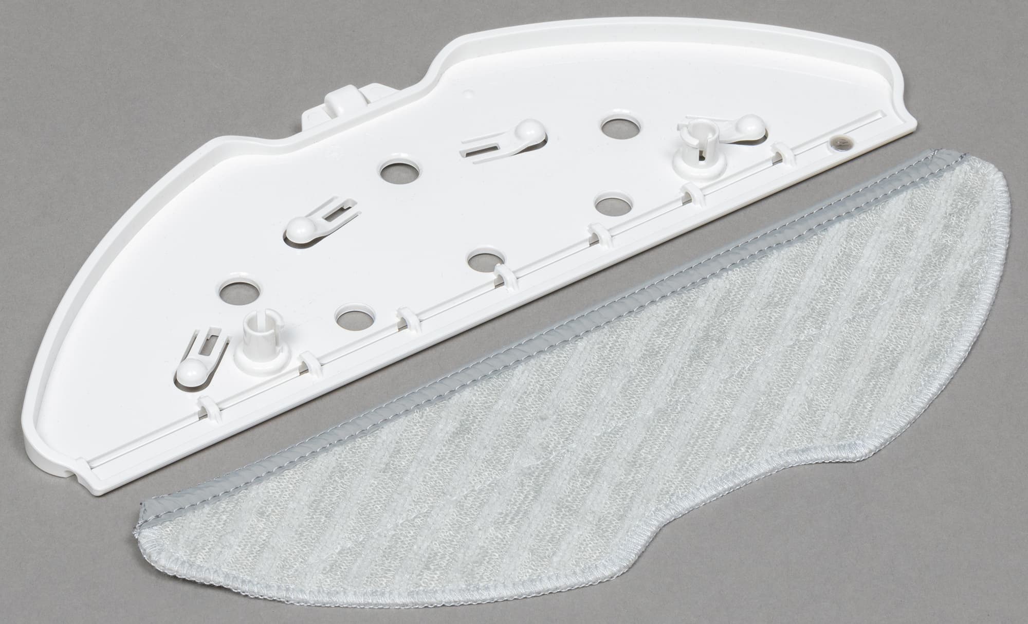 Держатель тряпки сделан из белого пластика. Салфетки прикрепляются к нему с помощью липучек-велкро, а сам держатель надевается на комбинированный контейнер. Сзади у держателя тряпки есть небольшое колесо, на которое робот может дополнительно опираться в процессе уборки.