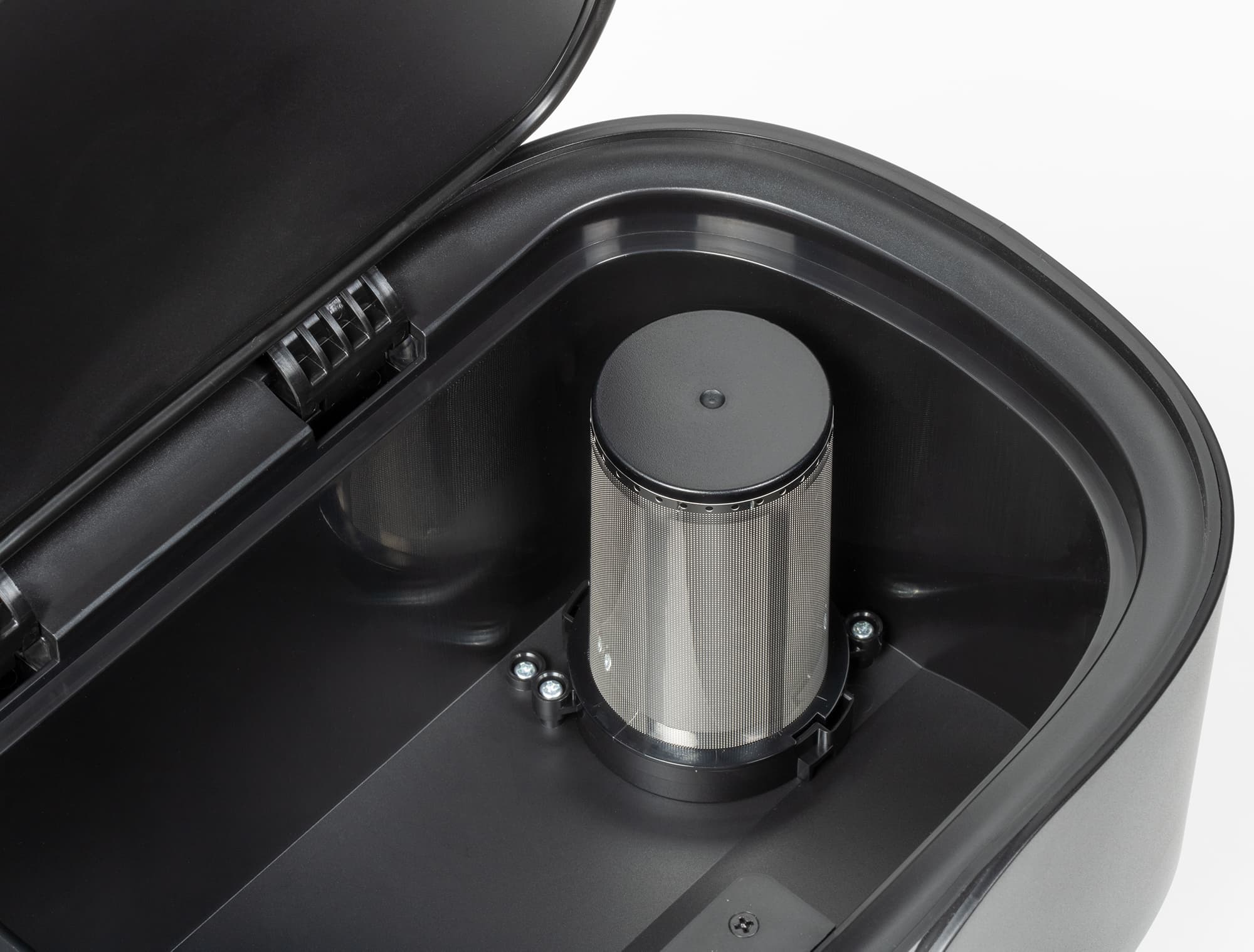 На дне контейнера находится решетка, под которой скрывается воздушный насос. От случайного засорения он защищен мелкой сеткой на круглой рамке.