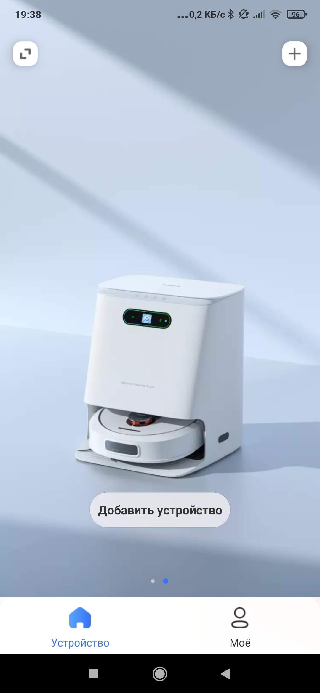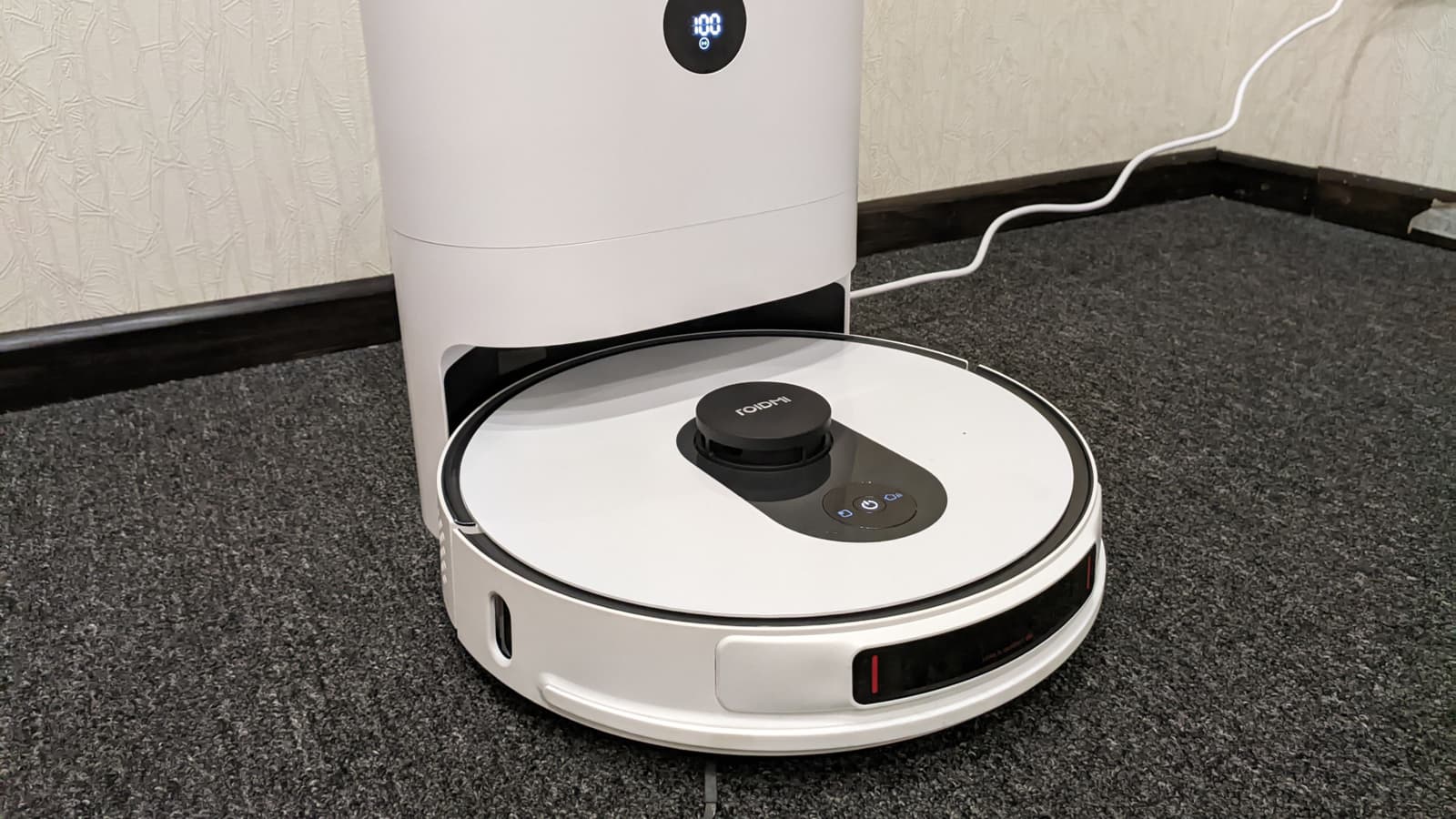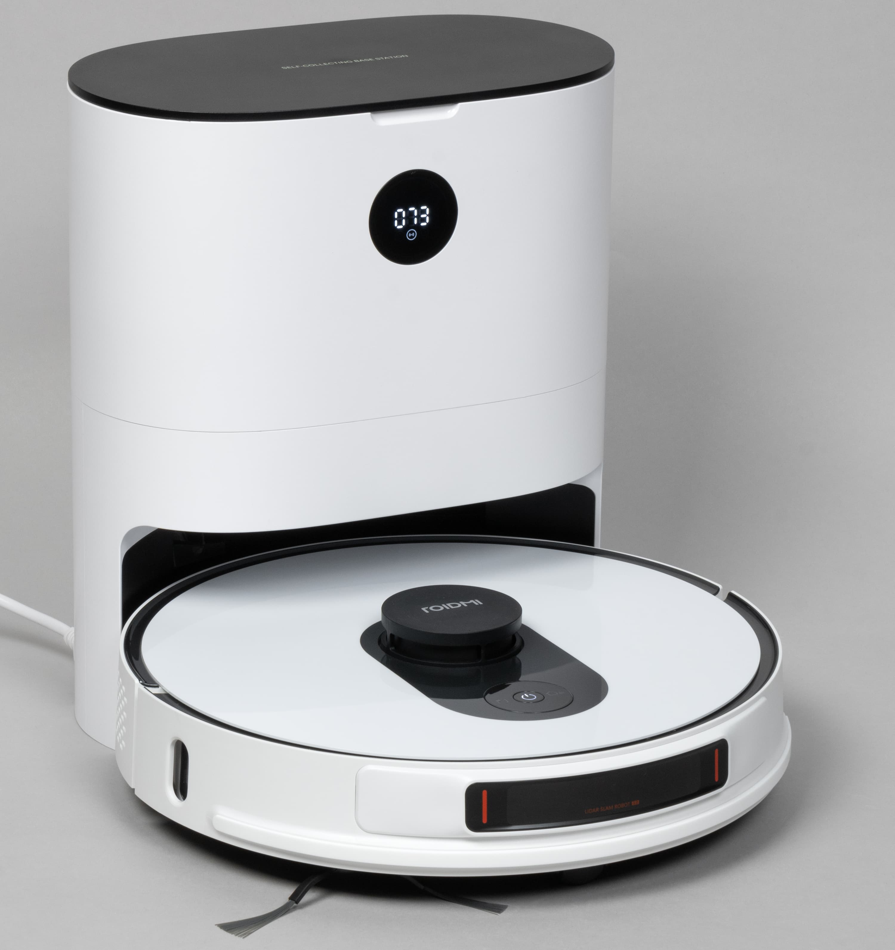 В базовую станцию встроен полноценный ЖК-экран, на котором можно проверить ключевые показатели (заряд АКБ, наличие Wi-Fi-соединения), прочесть коды ошибок и т. п., а нажав на экран, можно запустить сбор пыли.