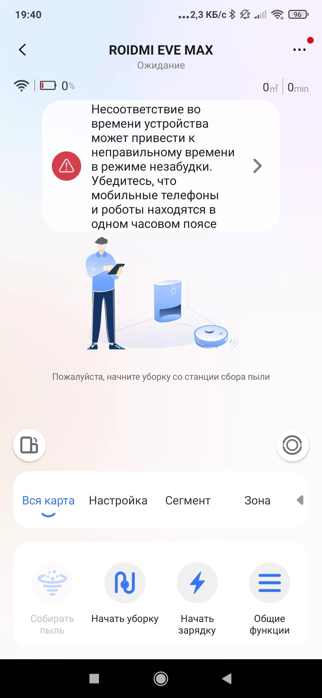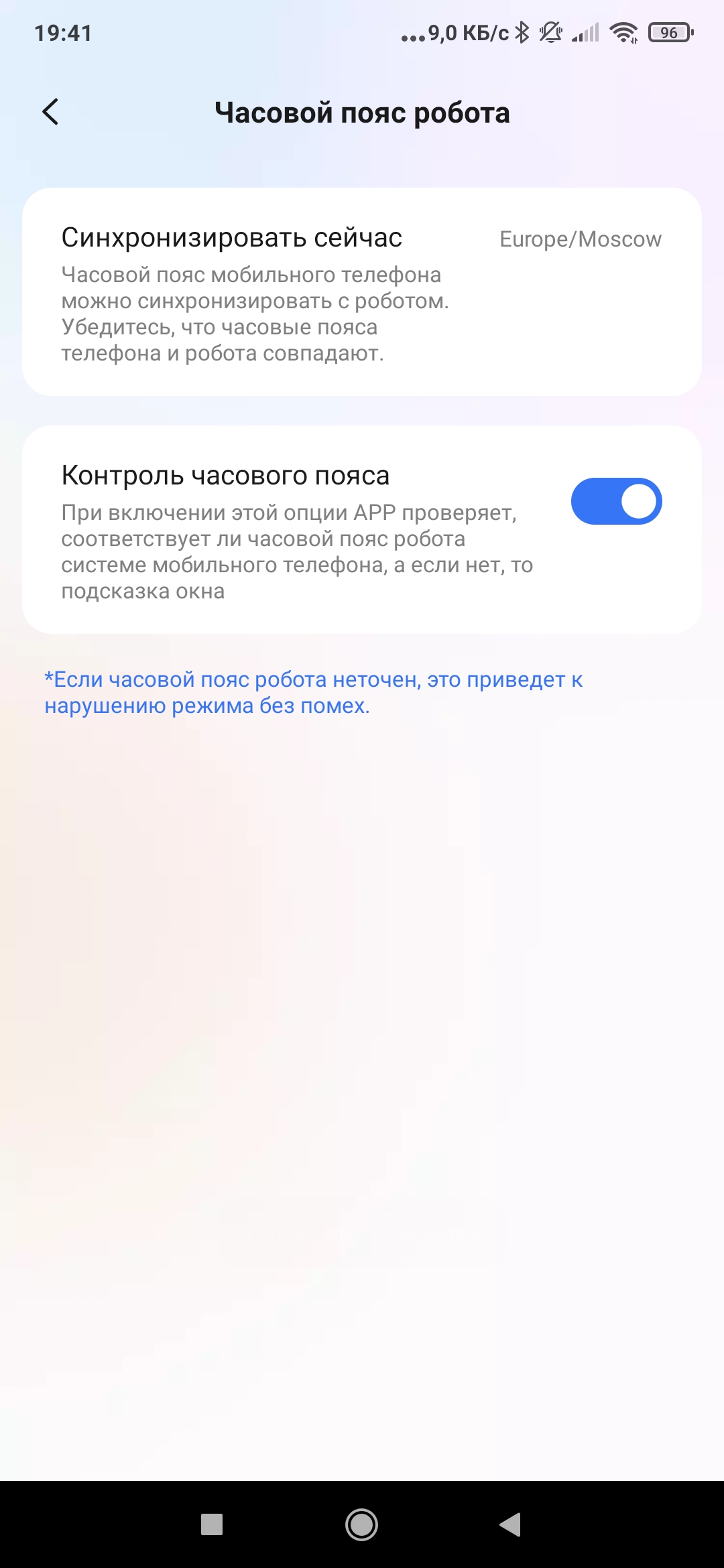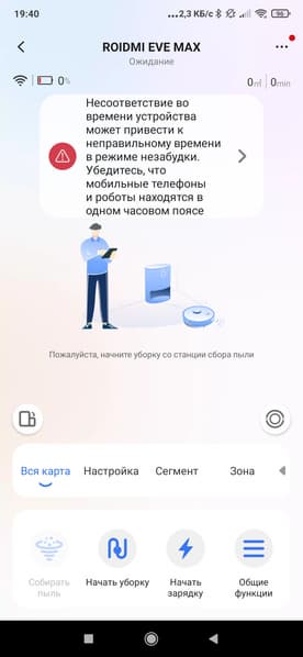После успешного сопряжения приложение дает нам ряд полезных советов и, наконец, допускает к главному окну управления роботом. Тут же рекомендуется проверить правильность настройки часового пояса. Это пригодится для настройки уборок по расписанию, а также для установки тихого/ночного режима, при котором пылесос не сбрасывает мусор в базу (это сопровождается значительным уровнем шума).