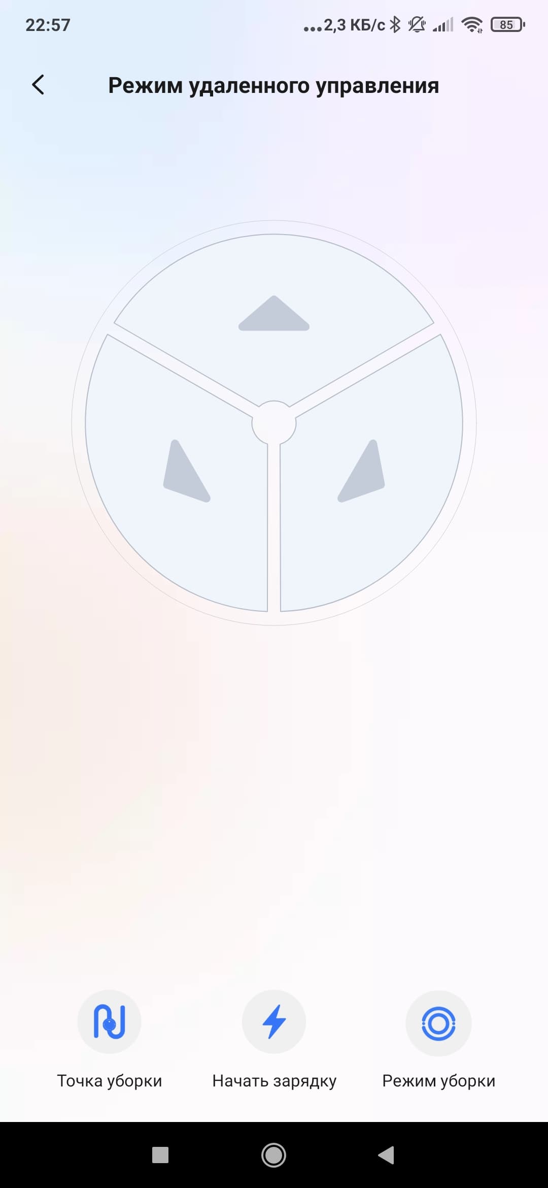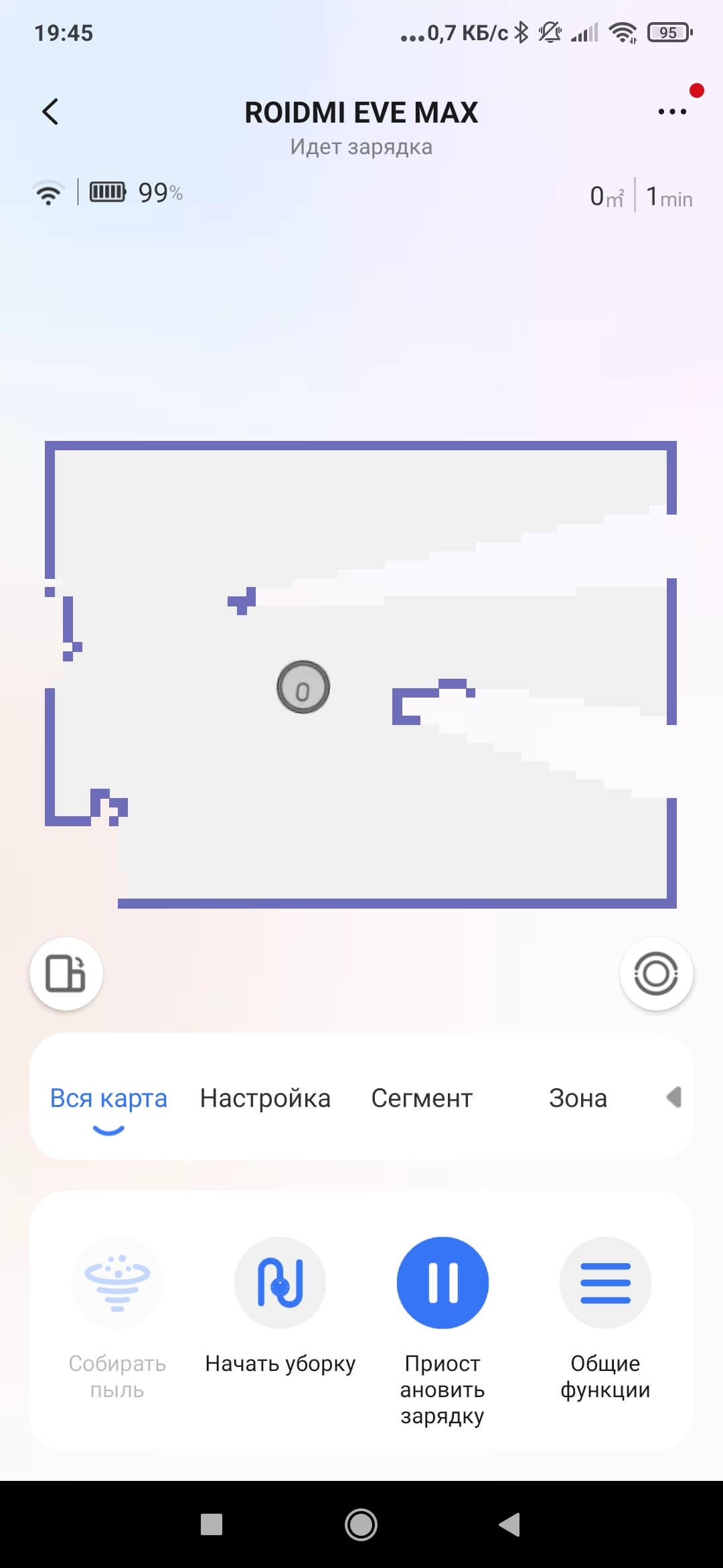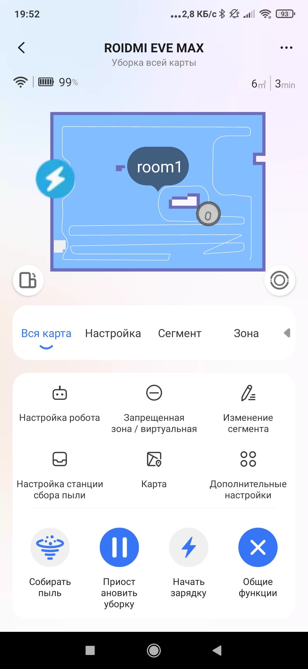 На главном экране нас ждет карта помещения (при первом запуске — пустая), а также доступ к основным функциям (начало работы, зарядка и т. п.). Все второстепенные режимы и настройки прячутся во вложенных пунктах меню.