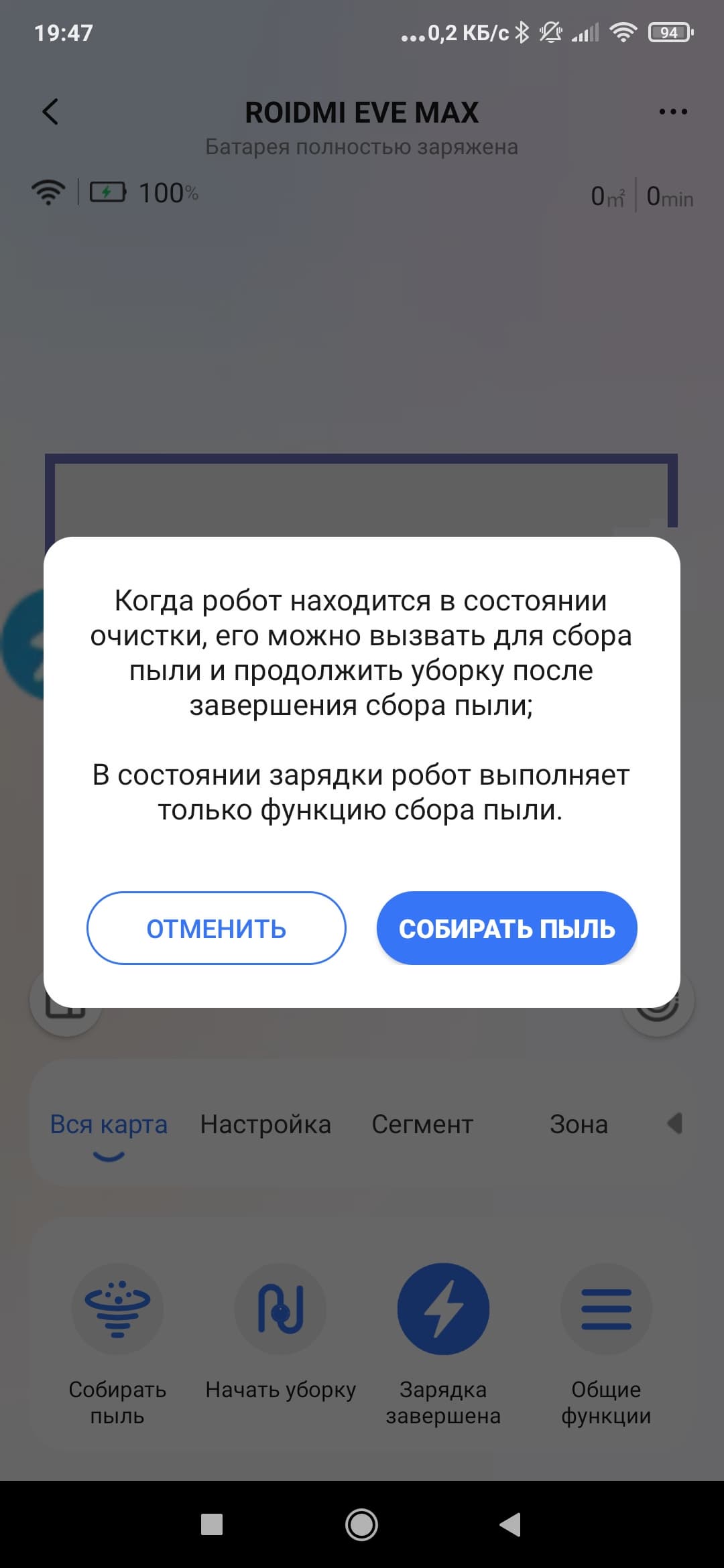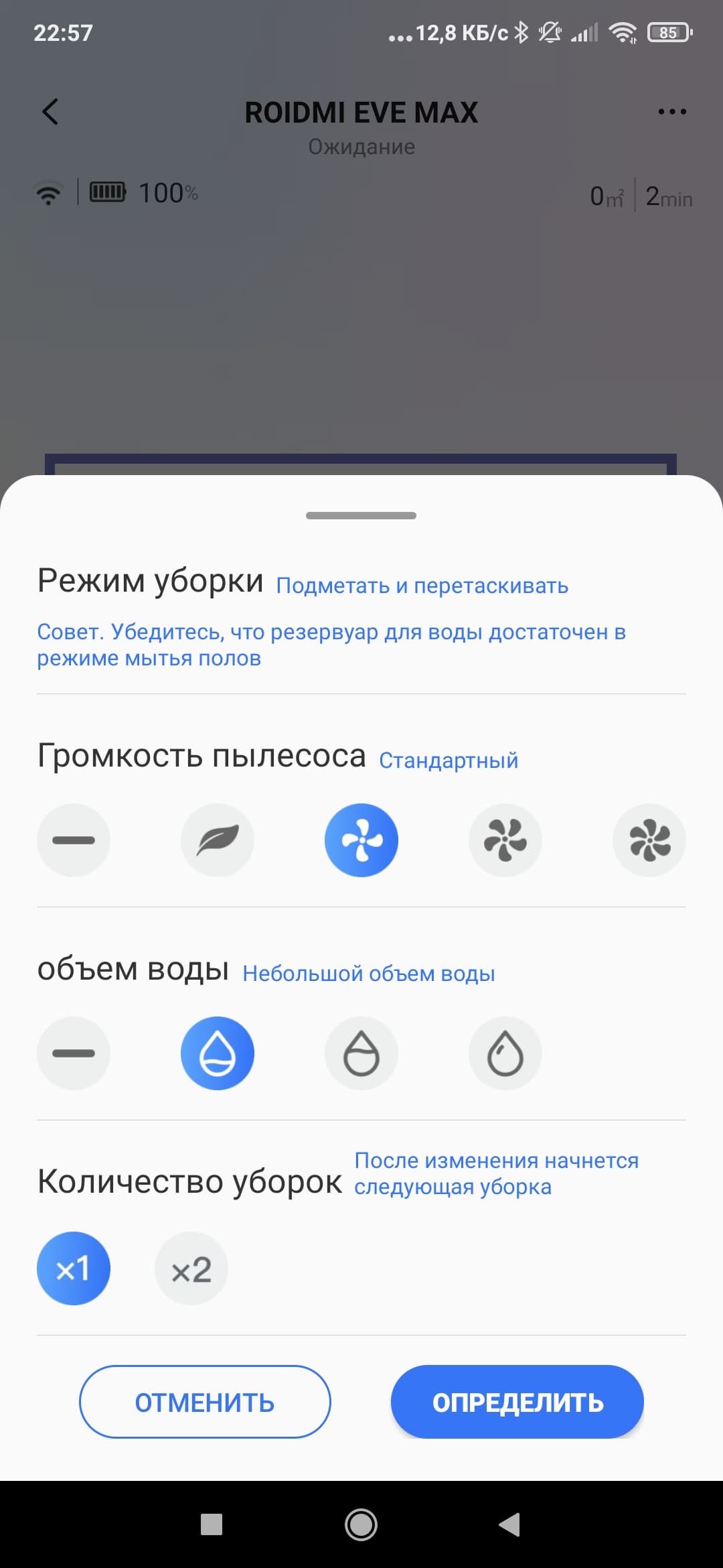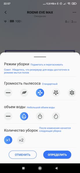 Что касается настроек, то тут нас в первую очередь интересуют доступные режимы. Мы можем выбрать сухую, влажную или комбинированную уборку, а также настроить силу всасывания и количество проходов по помещению.