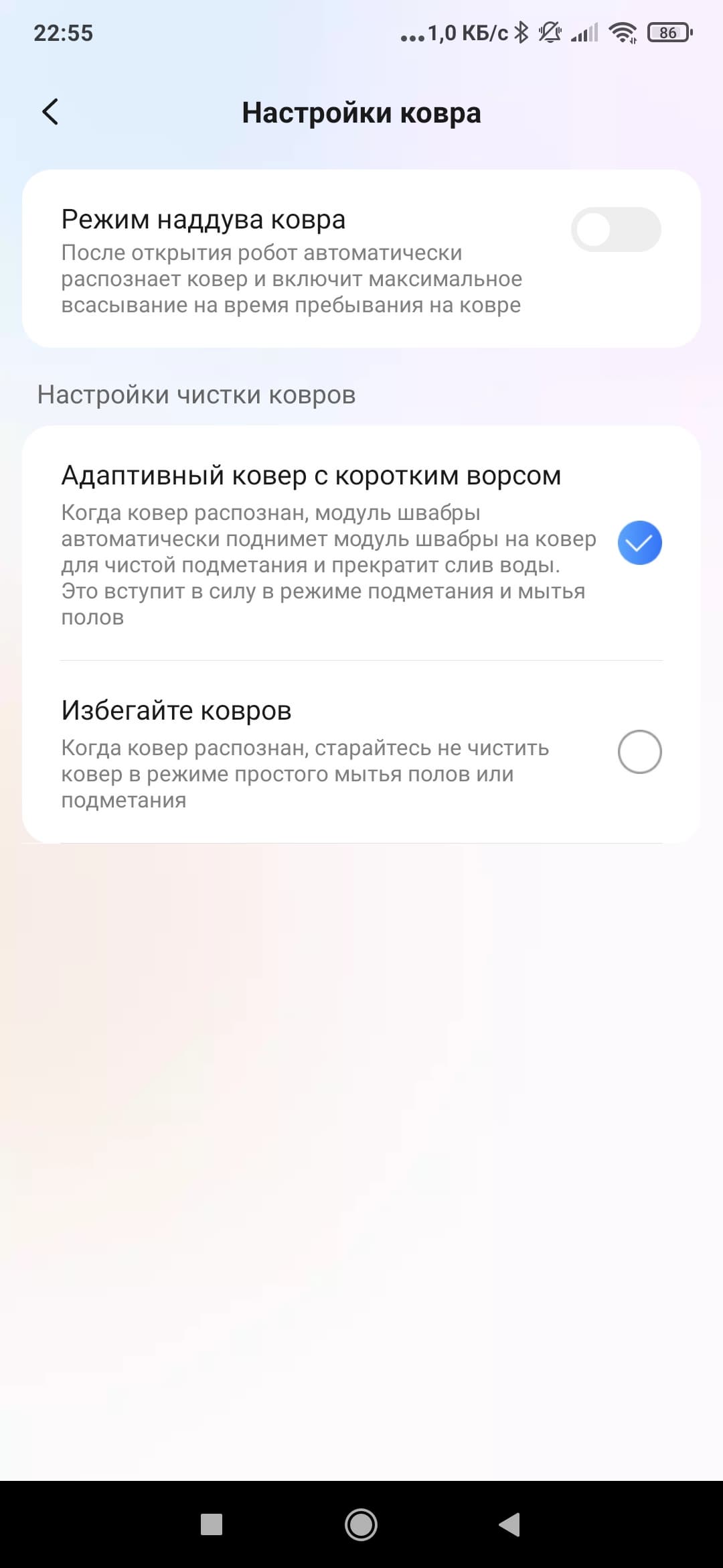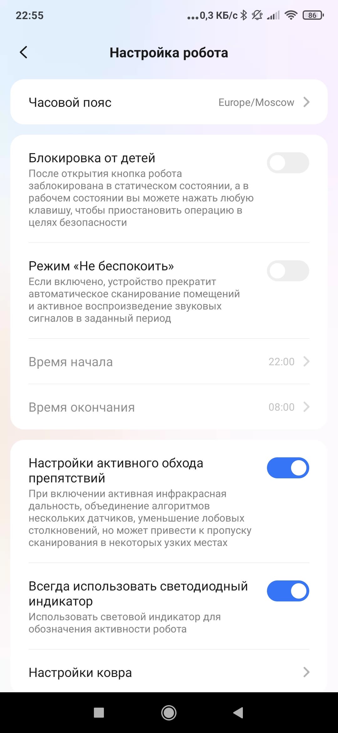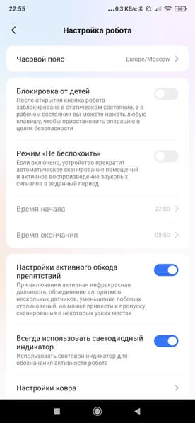 В расширенных настройках мы можем более точно настроить поведение робота (включить либо отключить режим «не беспокоить» в заданный промежуток времени, настроить действия робота при обнаружении ковров и т. п.).
