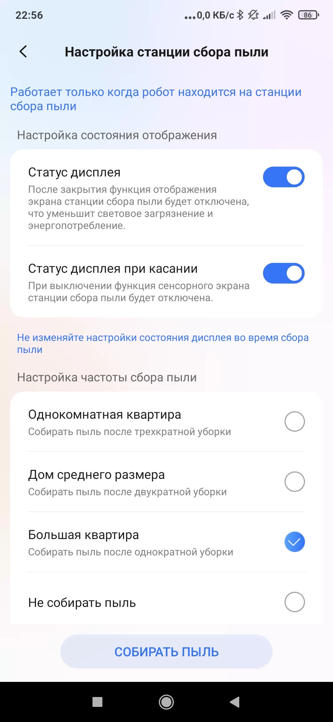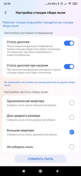 Жаль, что частоту сброса пыли можно настроить лишь в довольно жестких пределах (после одной, двух или трех уборок). С учетом того, что контейнер для мусора у нашего робота совсем небольшой, хотелось бы увидеть возможность его опустошения несколько раз за одну уборку.