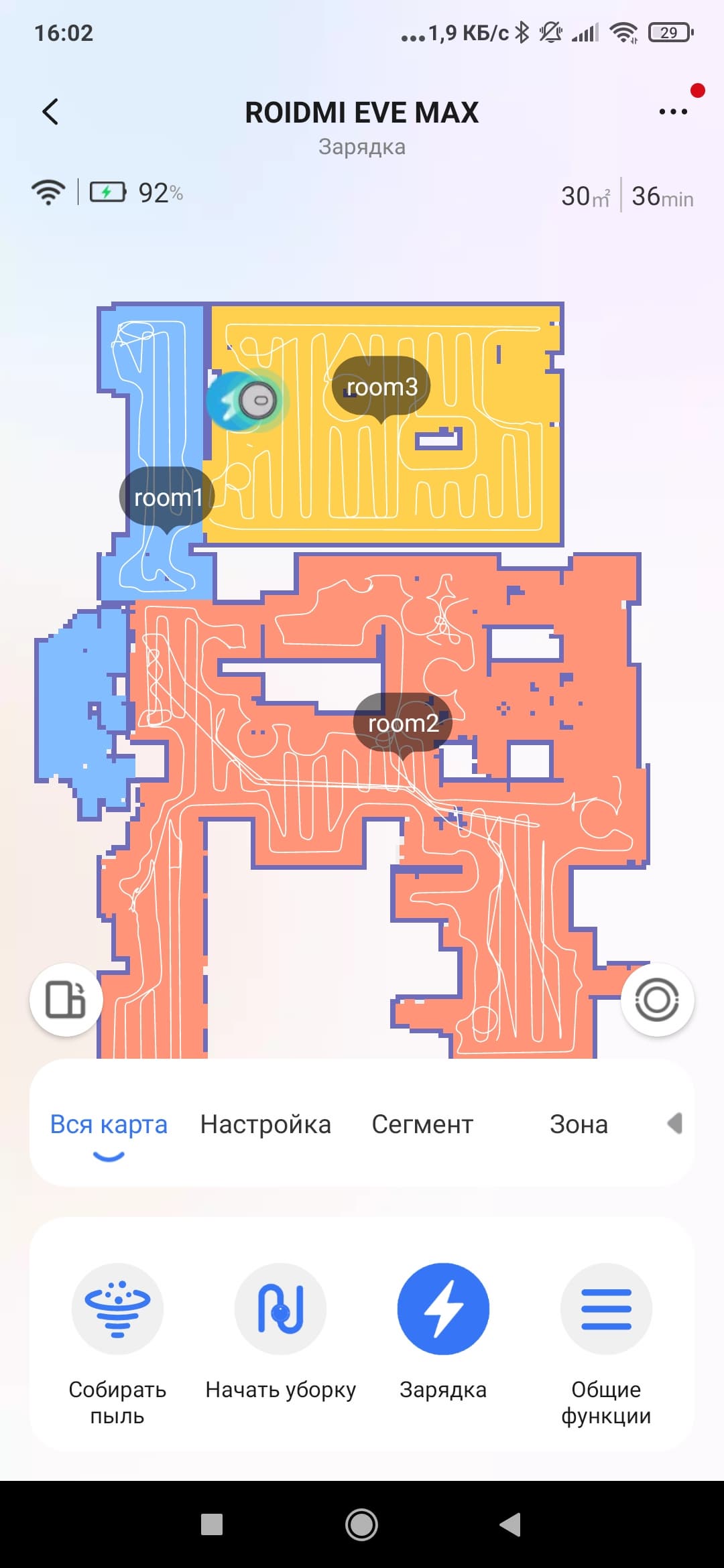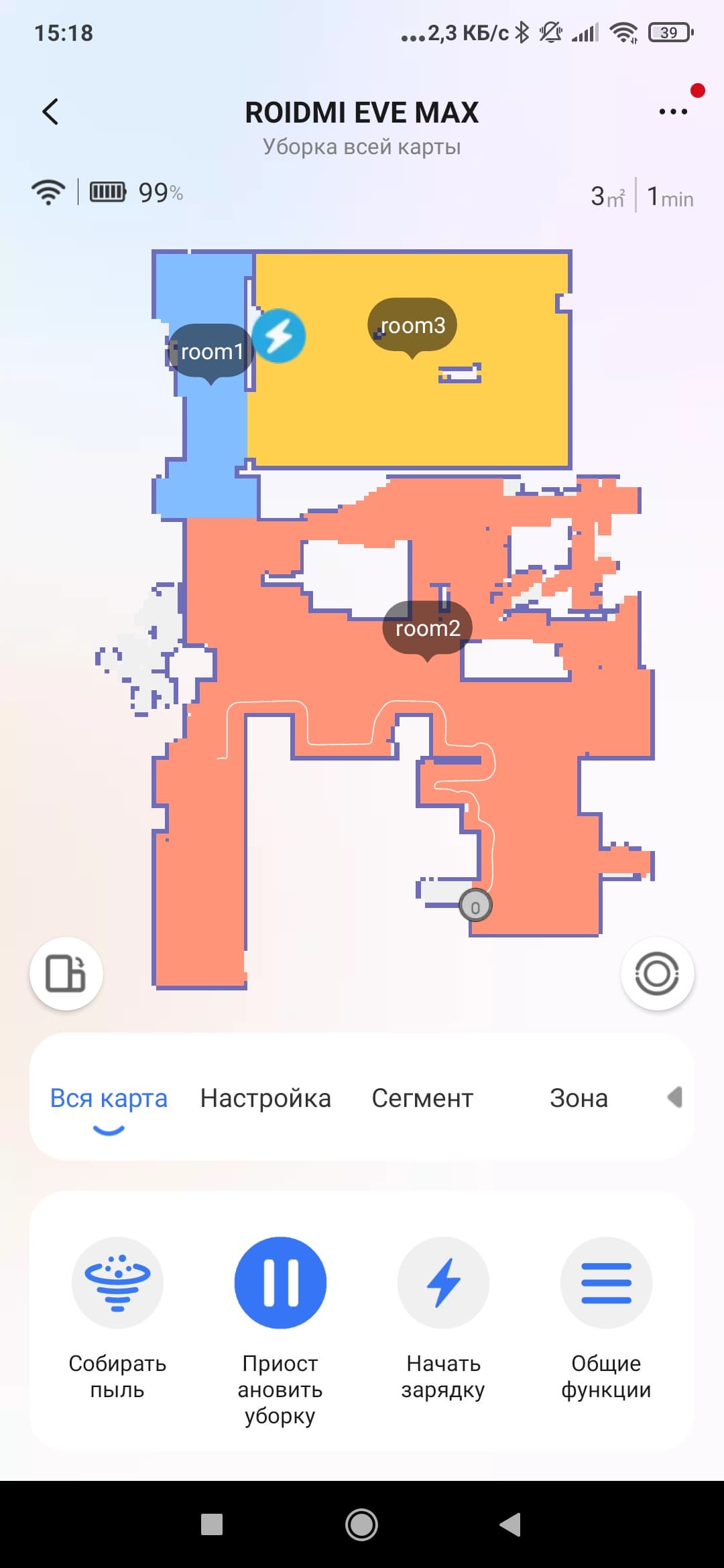 Отметим, что робот автоматически размечает комнаты (если он ошибся, то разметку можно исправить вручную). В нашем случае разметка прошла вполне успешно, однако некоторые комнаты робот разделил пополам, решив, что домашняя мебель — это повод поделить зону уборки на два участка.