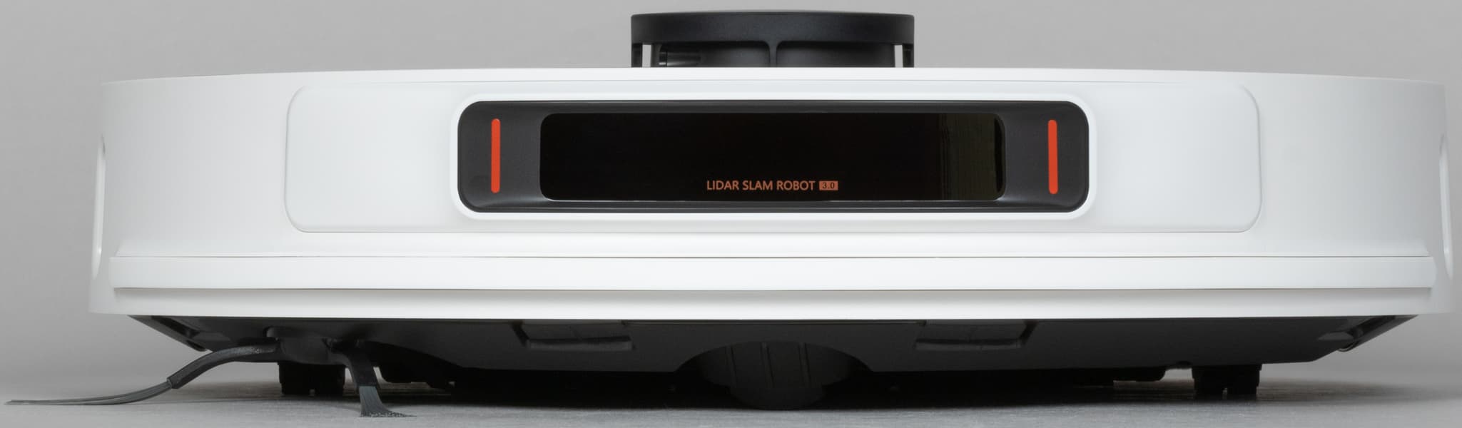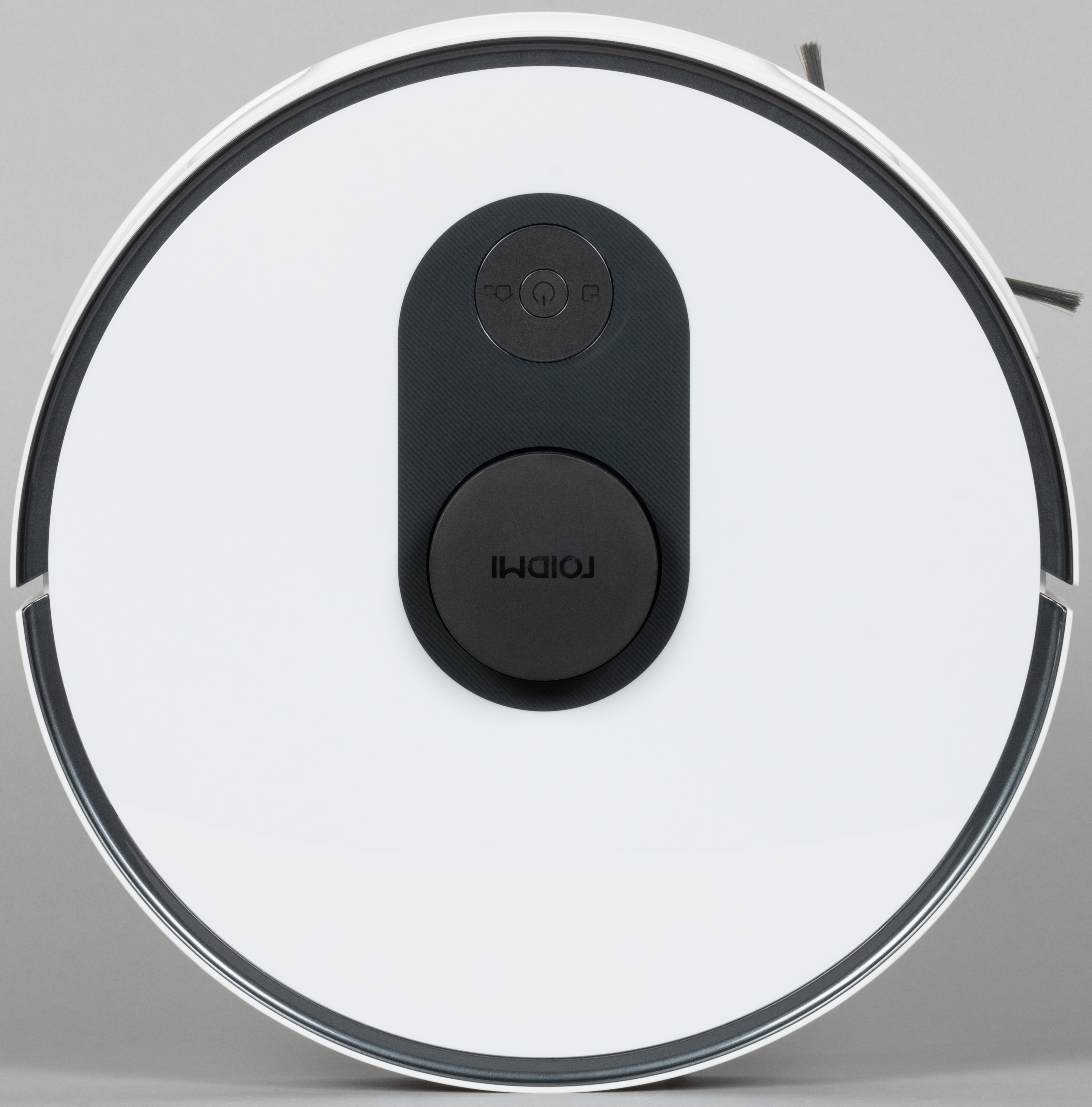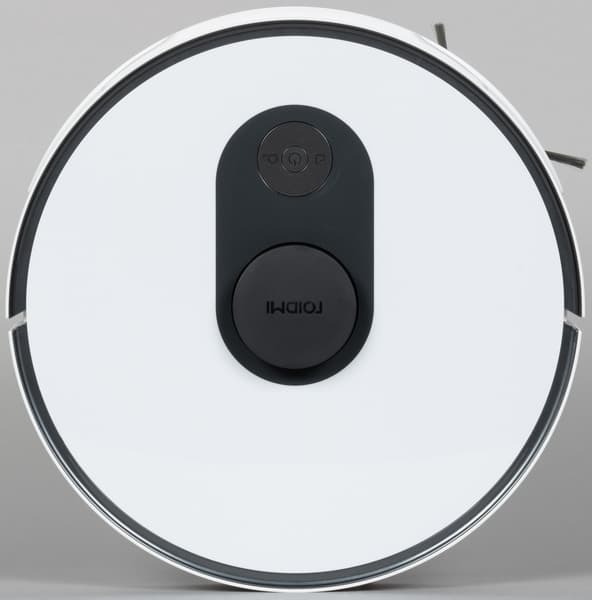 На верхней панели робота мы видим три кнопки для управления устройством. Они же служат для сопряжения робота с мобильным приложением (Roidmi или Mi Home). Также на верхней стороне возвышается башенка лидара с логотипом Roidmi. Больше сверху никаких элементов, заслуживающих внимания, не обнаружилось.
