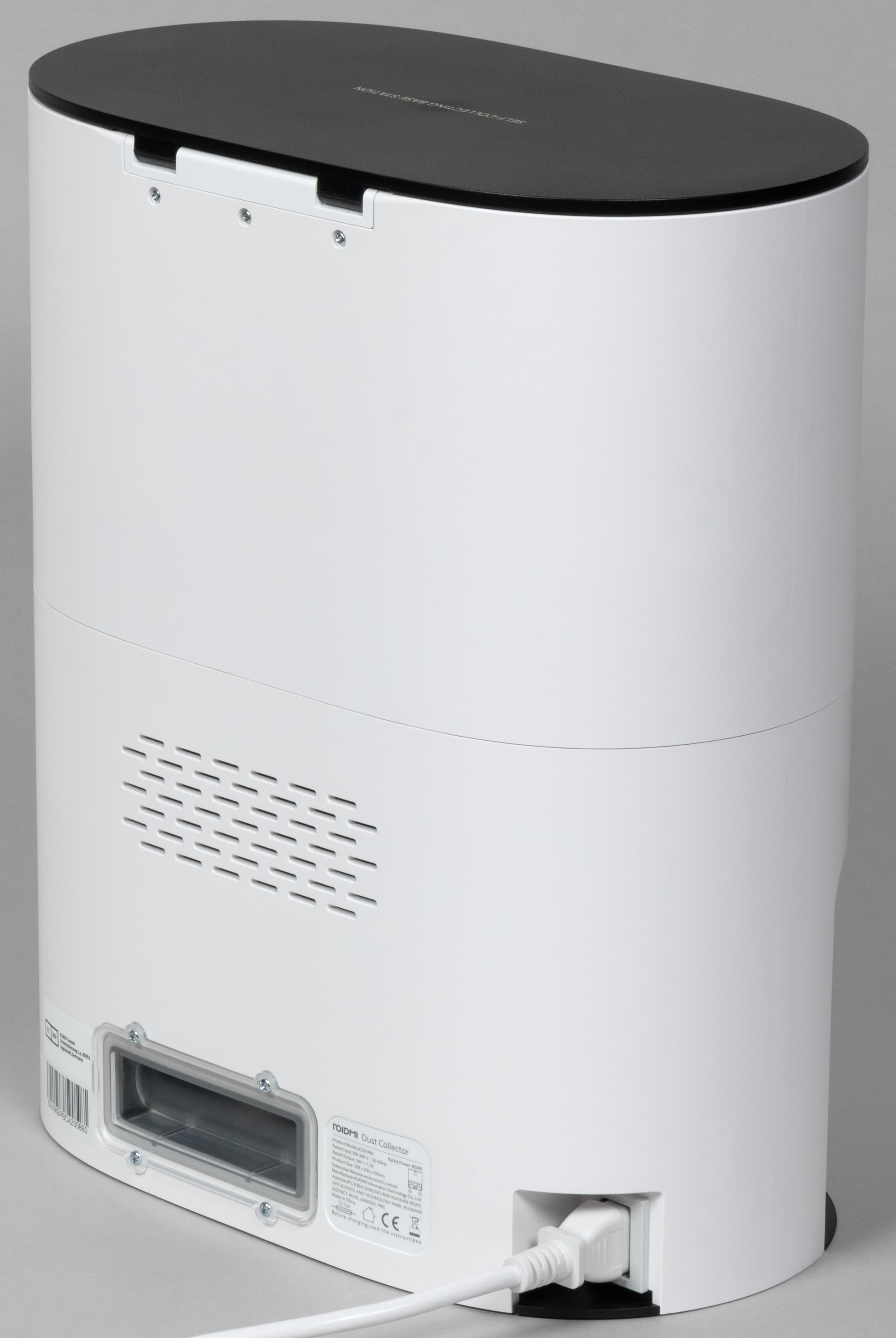 В нижней части базы мы можем рассмотреть прозрачную крышку пылевого канала: если канал засорится, то через это отверстие его можно будет очистить вручную.