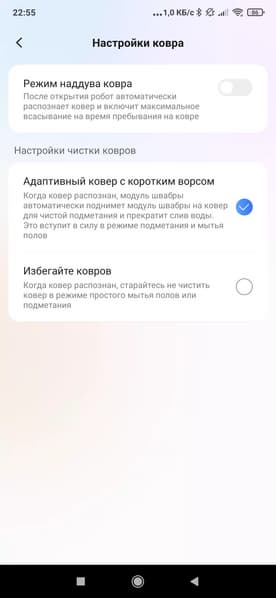 К базе робот стыкуется без каких-либо проблем, однако на ковровом покрытии ему иногда может потребоваться сделать пару попыток. Ковры, кстати, распознаются автоматически (если включена соответствующая опция в настройках). При обнаружении коврового покрытия робот автоматически приподнимет швабры и включит повышенную мощность всасывания. Что касается влажной уборки, то она будет производиться по всей площади за исключением ковров и вручную отмеченных зон. Если в процессе протирания полов в контейнере закончится вода, то робот автоматически перейдет в режим сухой уборки — очень удобно, не нужно волноваться, что при нехватки воды квартира будет убрана наполовину.