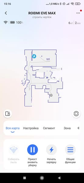 В автоматическом режиме при попадании в незнакомое помещение прибор сначала осматривается, после чего прогуливается и строит карту, и лишь потом приступает непосредственно к уборке. Вот как выглядит процесс составления карты на примере нашего тестового помещения.