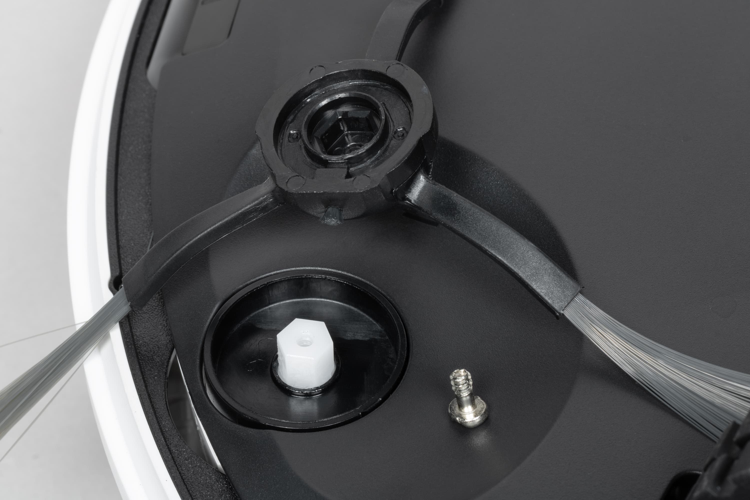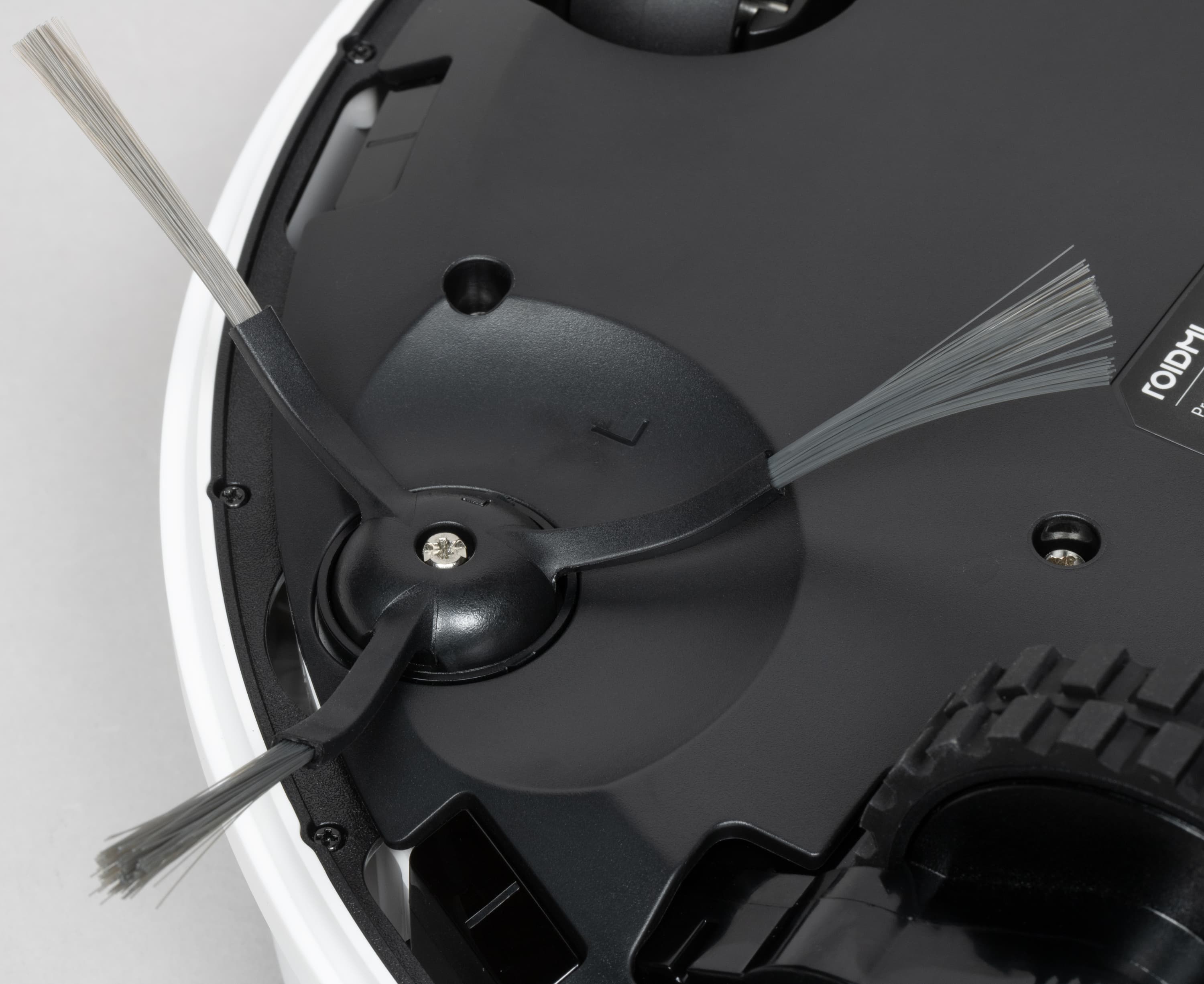 Боковая щетка у нашего робота всего одна — это на сегодняшний день своего рода новый тренд для умных роботов: после многочисленных экспериментов большинство производителей пришли к выводу о том, что при правильно настроенной системе навигации наличие или отсутствие второй щетки не влияет на качество уборки. На своем месте боковая щетка крепится с помощью одного винта.