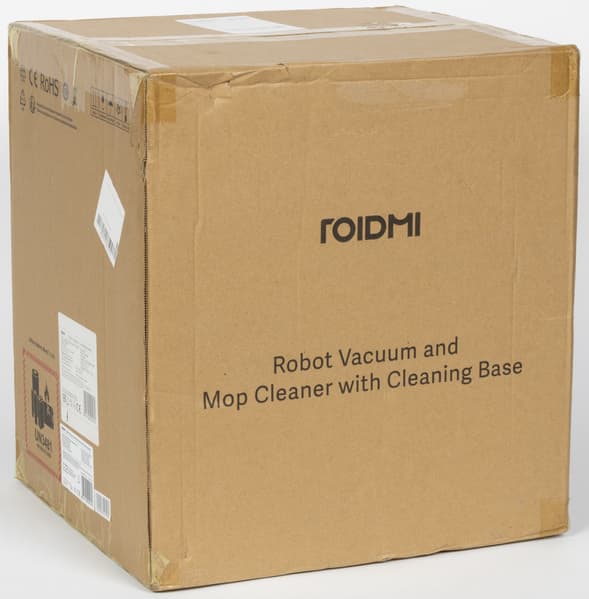 Робот-пылесос попал к нам на тестирование упакованным в двойную объемную коробку-кубик. Внешняя коробка из технического картона призвана защитить от потенциальных повреждений внутреннюю, «парадную» коробку.