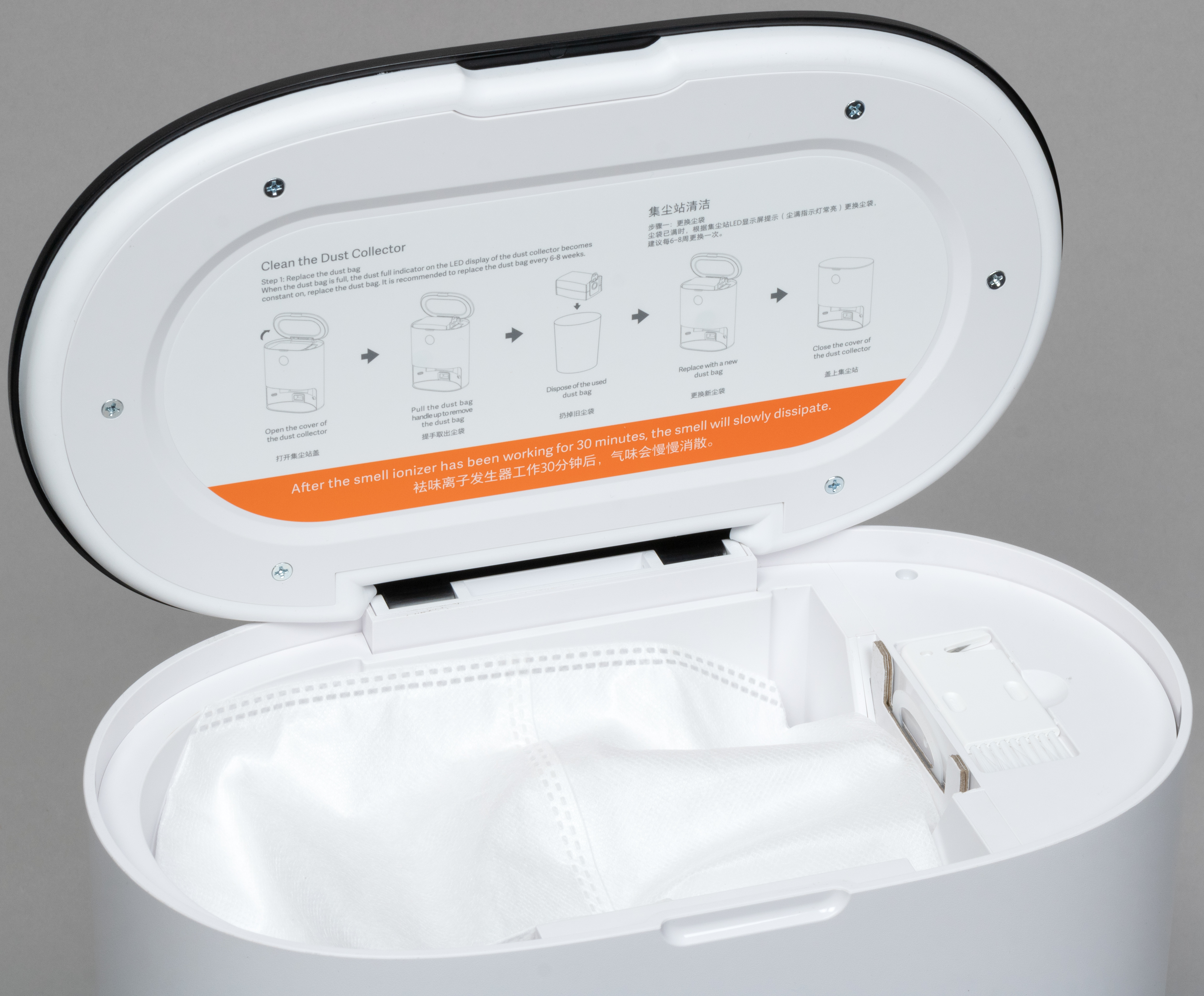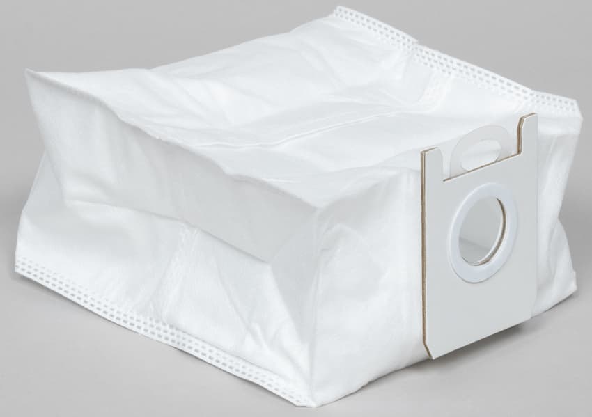 Рамка из картона позволяет базе проверить правильность установки мешка, а пластиковая шторка не даст мусору высыпаться пока пользователь несет мешок до мусорного ведра. Объем мешка для мусора составляет около 3 литров.