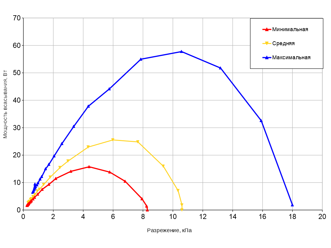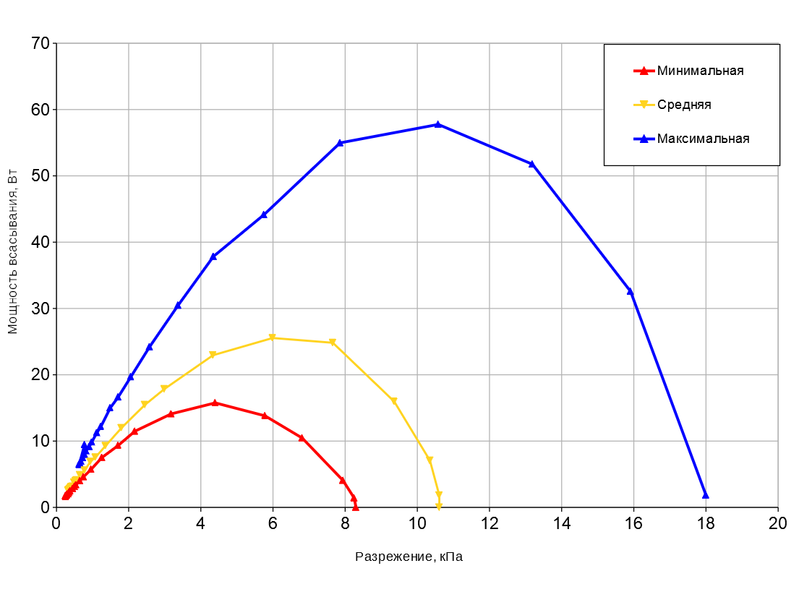 Зависимость мощности всасывания от создаваемого разрежения приведена на графике ниже: