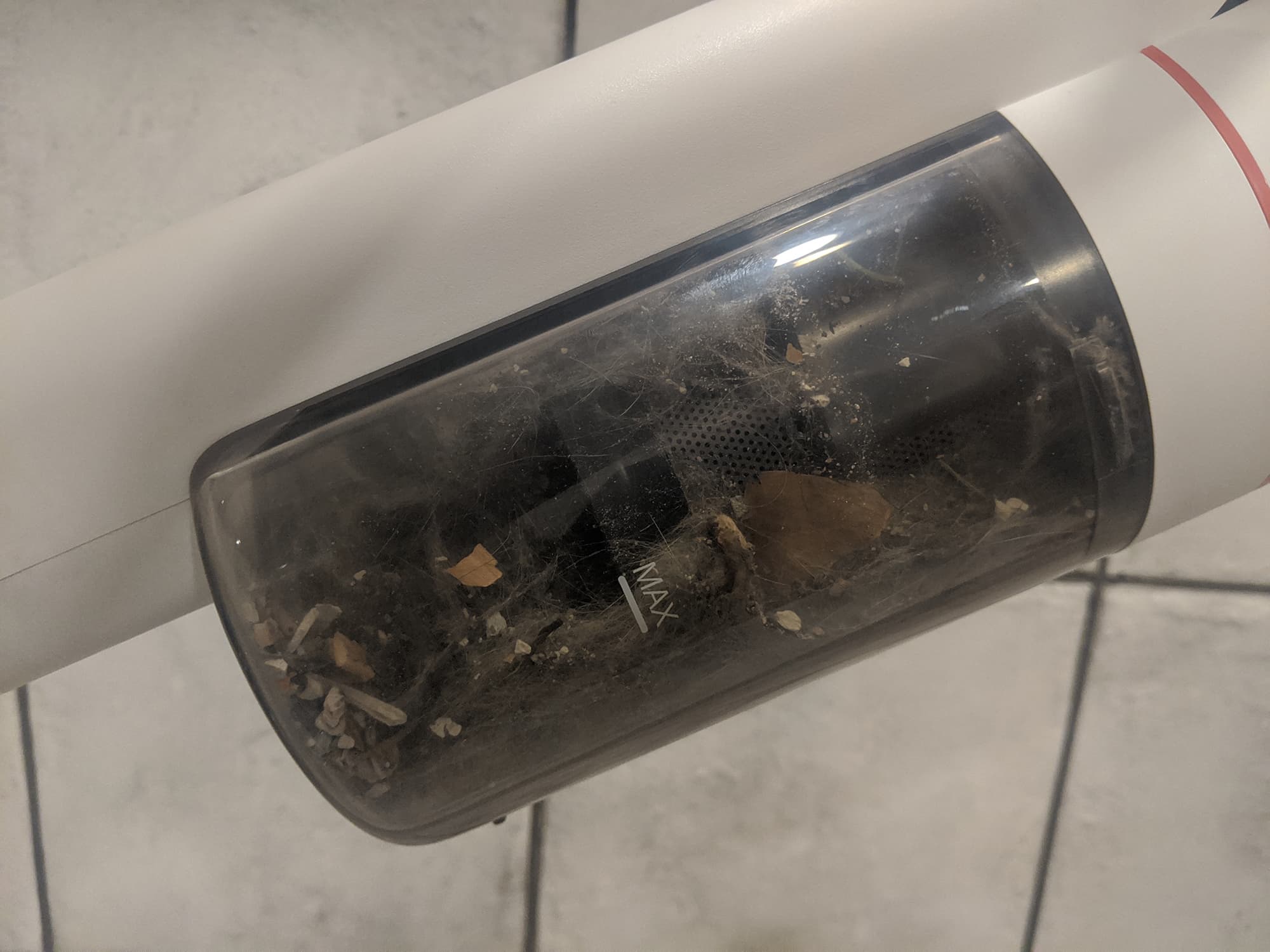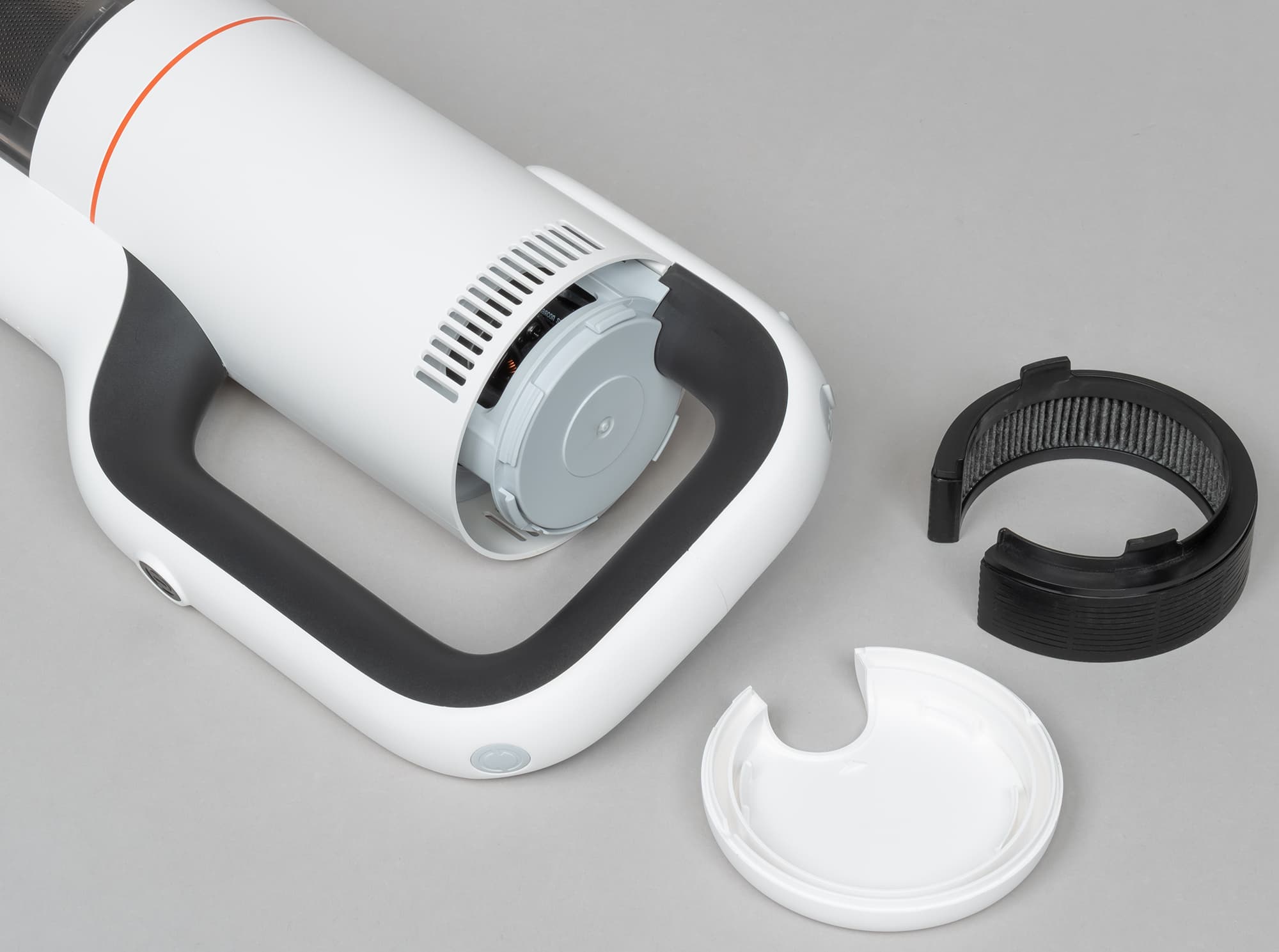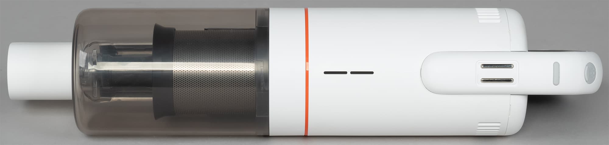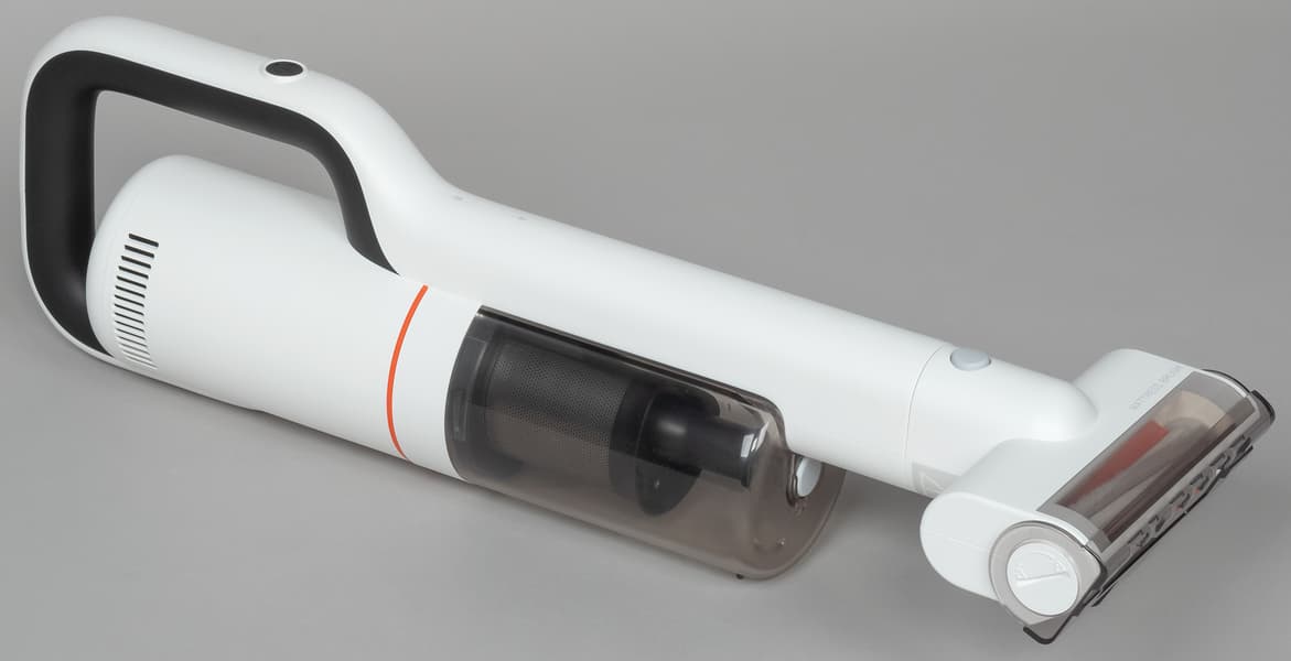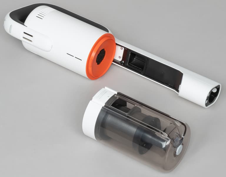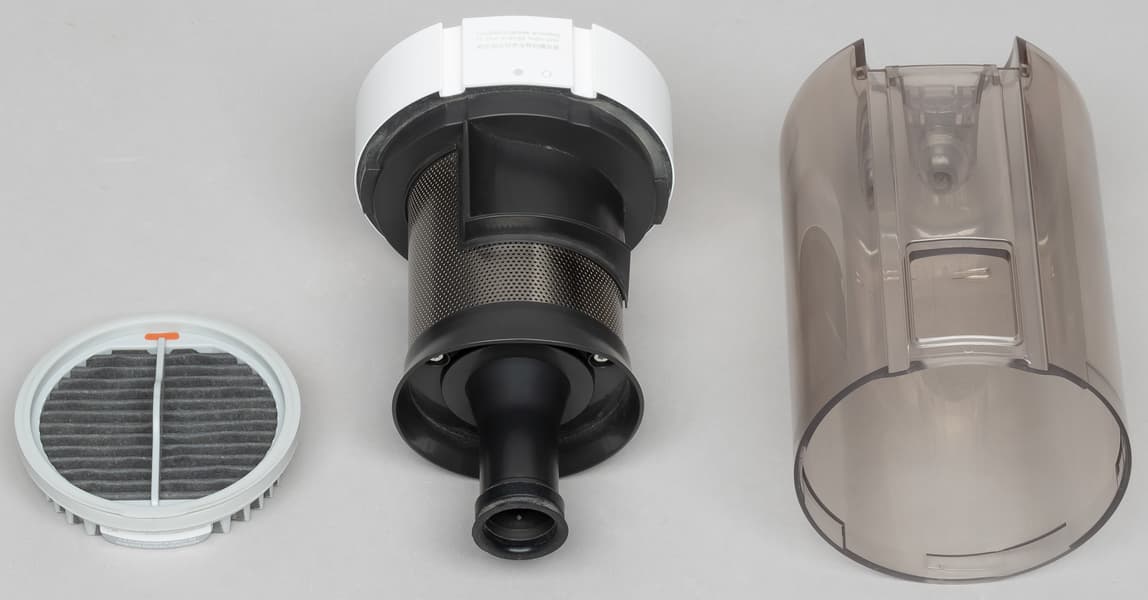 Переднюю часть моторного блока занимает цилиндрический мусоросборник. Корпус фильтра сделан из сероватого полупрозрачного пластика. Пылесос Roidmi X20 оборудован трехступенчатой фильтрацией: циклонным фильтром грубой очистки, HEPA-фильтром для фильтрации мелкой пыли и выпускным HEPA-фильтром.
