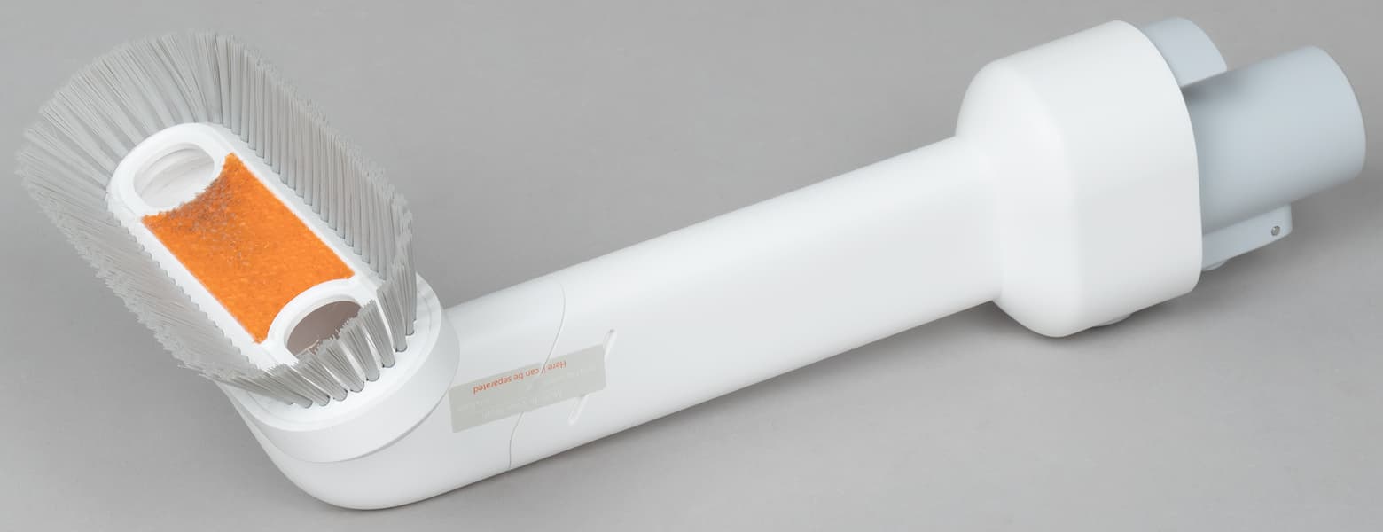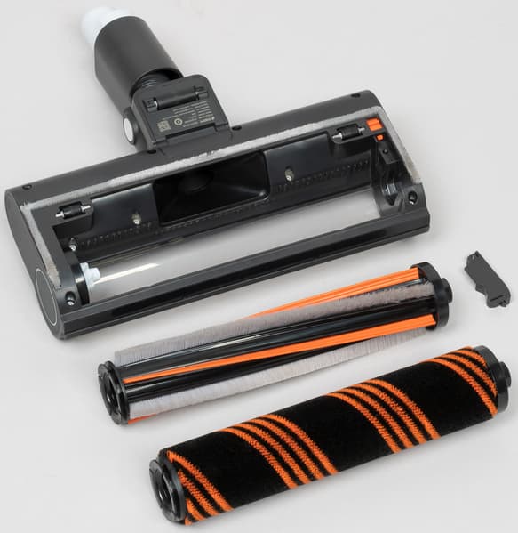 Турбощетка фиксируется в насадке при помощи защелки оранжевого цвета и может быть легко извлечена из нее для очистки или смены. Насадка оборудована двумя турбощетками: первая из них, из велюра, предназначена для гладких и твердых напольных покрытий, а турбощетка с силиконовыми ламелями, перемежающимися жесткими спиралевидными щетками из синтетической щетины — для мягких напольных покрытий и ковров.