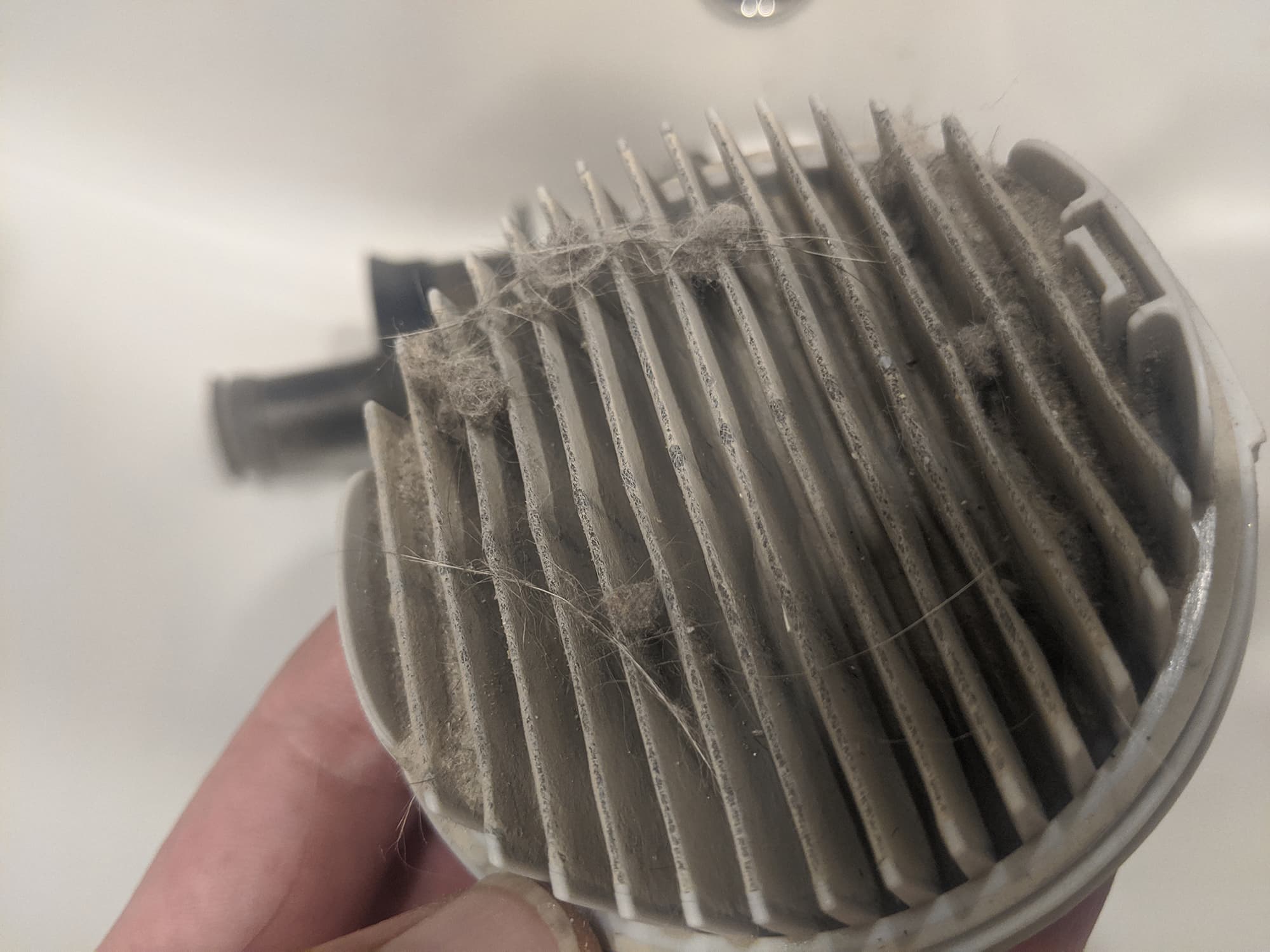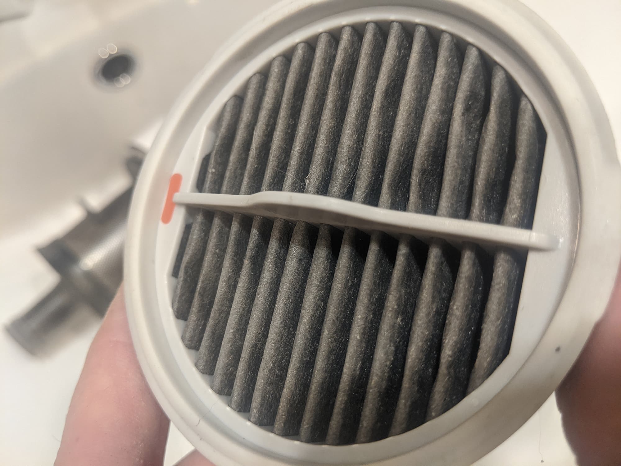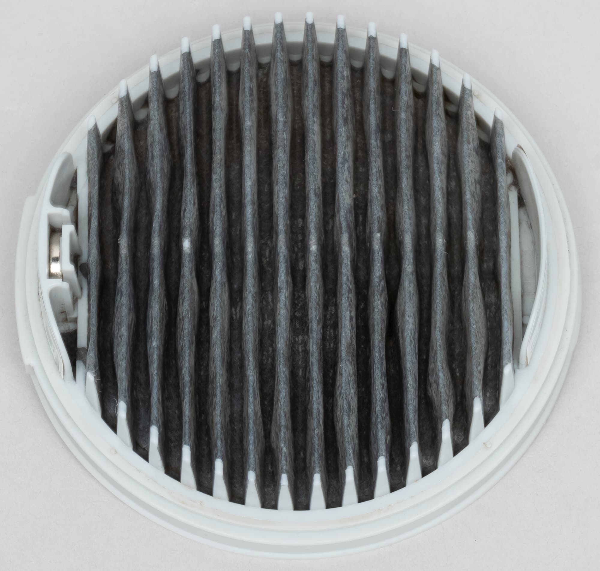 Фильтр тонкой очистки представляет собой диск с «гармошкой» фильтрующего материала. Для лучшего прилегания к корпусу мусорного контейнера боковая сторона диска выполнена из плотного силикона. На верхней стороне фильтра тонкой очистки находится ручка-выступ из того же материала для удобного извлечения фильтровального блока.
