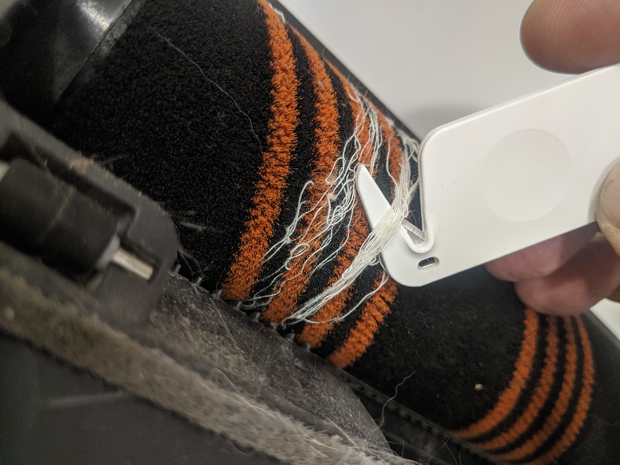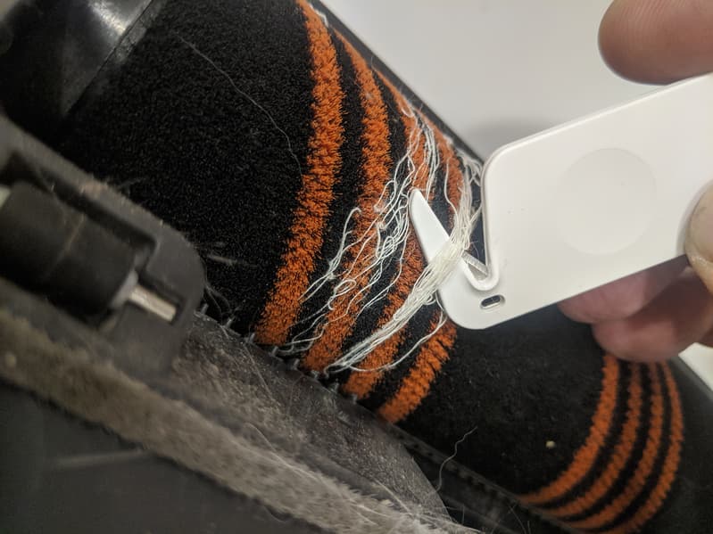 Намотавшиеся на турбощетки длинные волосы и нитки (обычная проблема для всех вертящихся щеток) отлично удаляются при помощи специального крючка с лезвием, входящего в комплект пылесоса: аксессуар копеечный, очень удобный и почему-то крайне редко встречающийся.