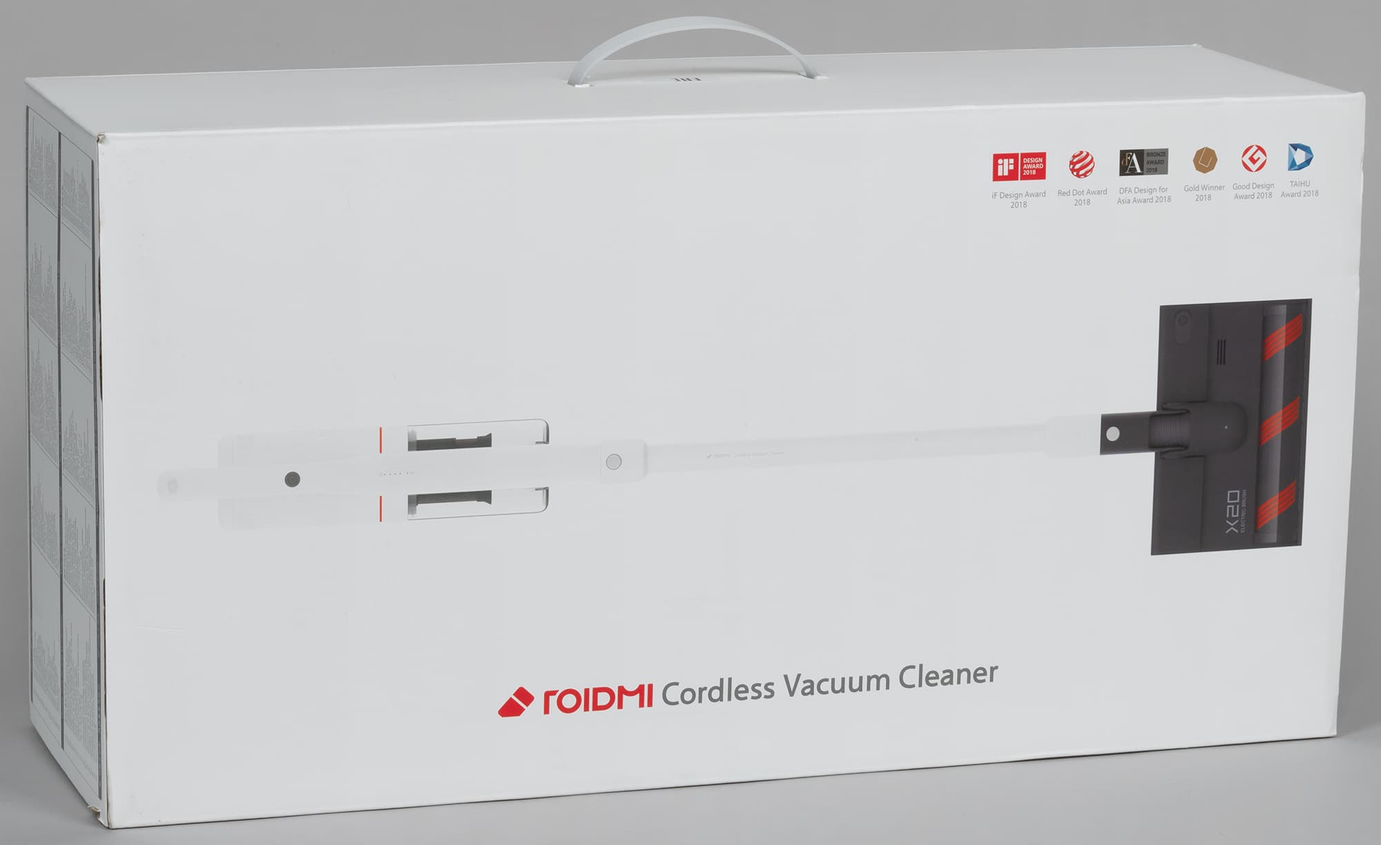 Коробка сделана из белого глянцевого картона. На ее широких сторонах изображен пылесос с самой большой щеткой и перечислены награды, которые получили его разработчики в 2018 году. Заметим, что название модели написано на щетке. Верхняя часть коробки снабжена пластиковой ручкой, а на нижней имеется QR-код со сведениями для продавца.