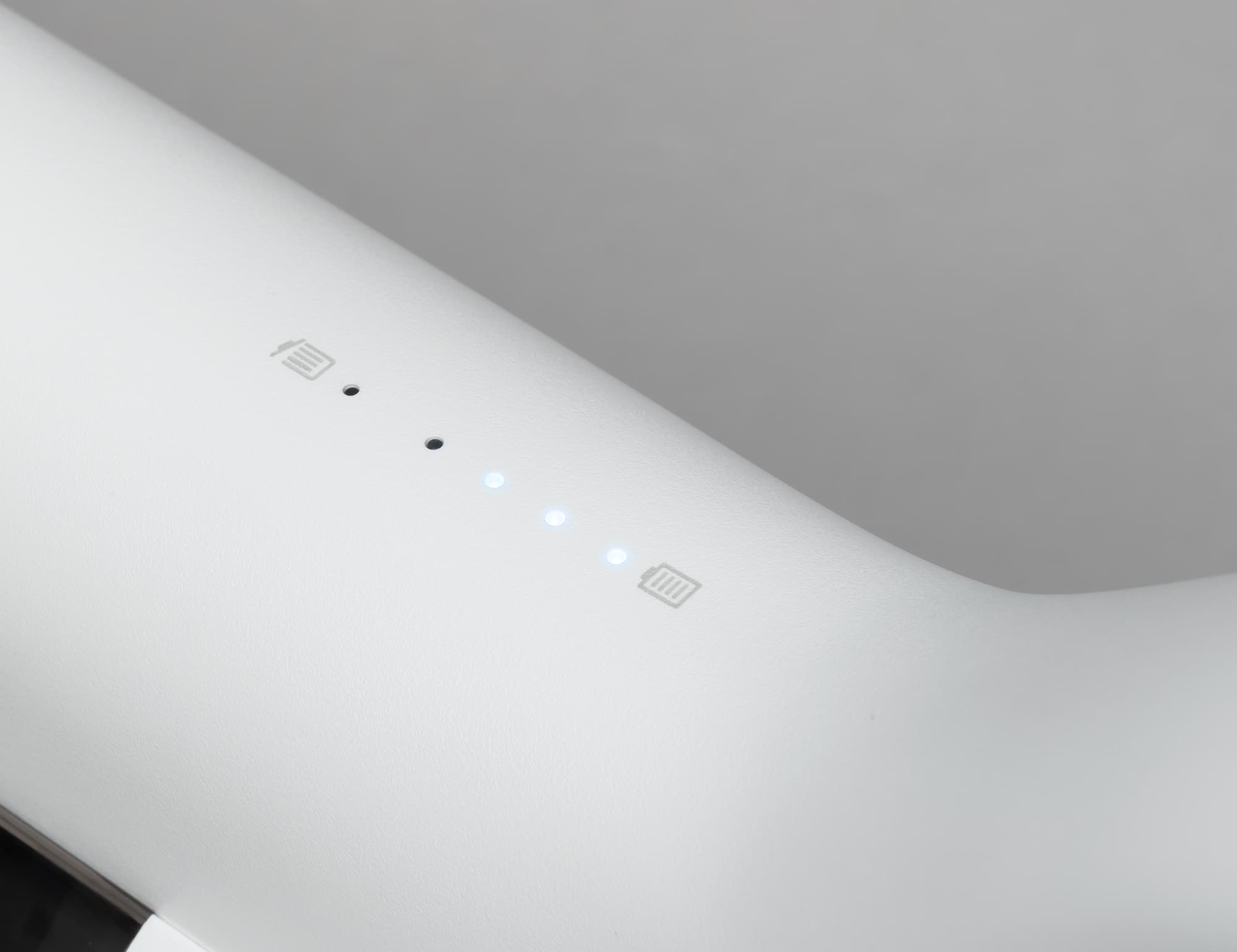 На рукоятке пылесоса имеются пять светодиодов. Четыре из них, белого цвета, предназначены для индикации уровня заряда аккумулятора, а пятый, RGB-светодиод, загорается красным при разного рода неисправностях и голубым — для индикации работы модуля Bluetooth (это, кажется, первый попавший к нам на тестирование пылесос с функцией Bluetooth). Чуть выше на рукоятке располагается круглая черная кнопка включения, за ней — серая кнопка переключения режимов работы.