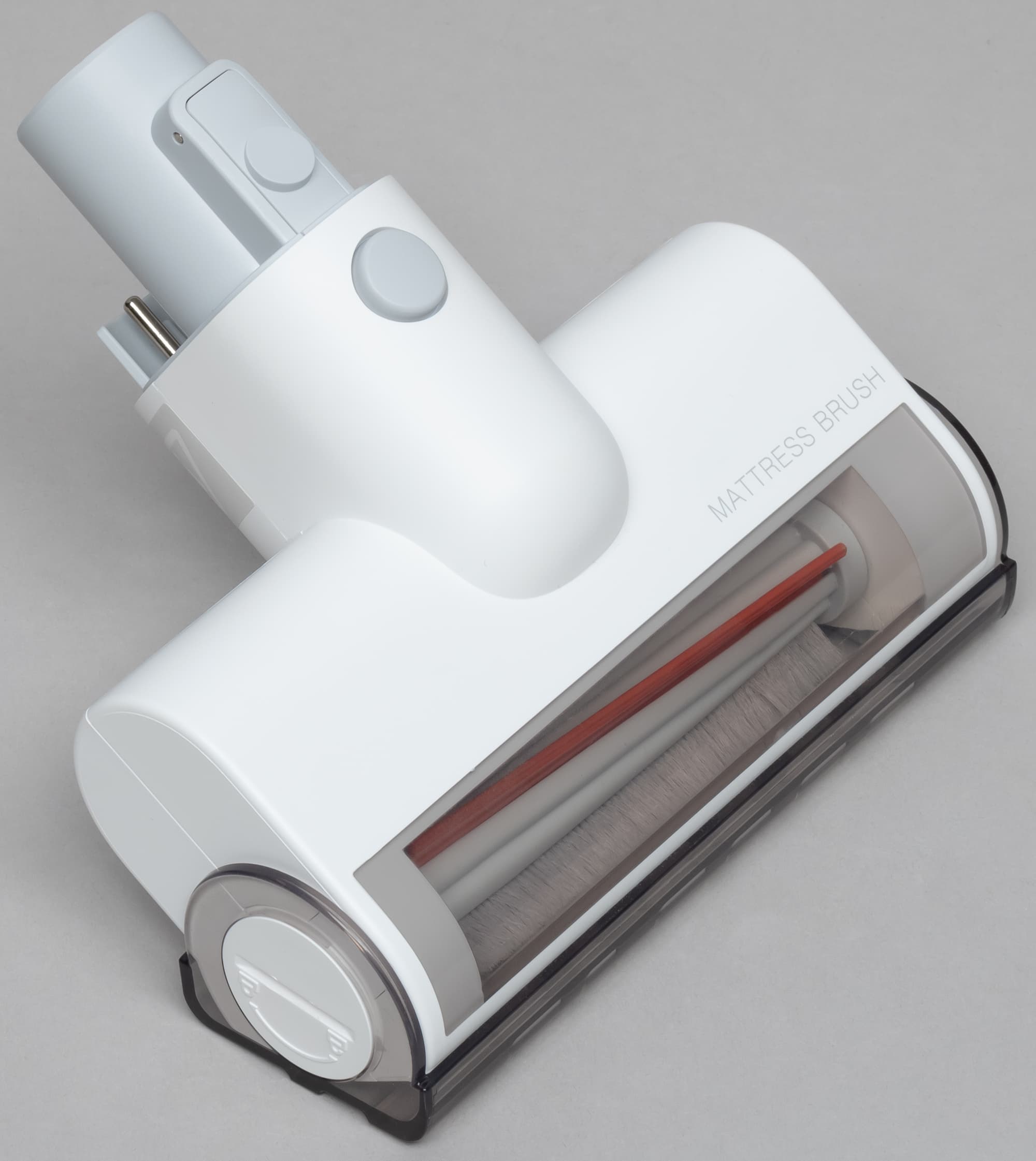 Мебельная турбонасадка представляет собой уменьшенную и упрощенную копию напольной насадки. В ней нет подсветки и датчика освещенности, крепится к удлинительной трубке она жестко, без возможности изгиба. Вместо этого поворачивается полупрозрачный кожух, прикрывающий турбощетку.