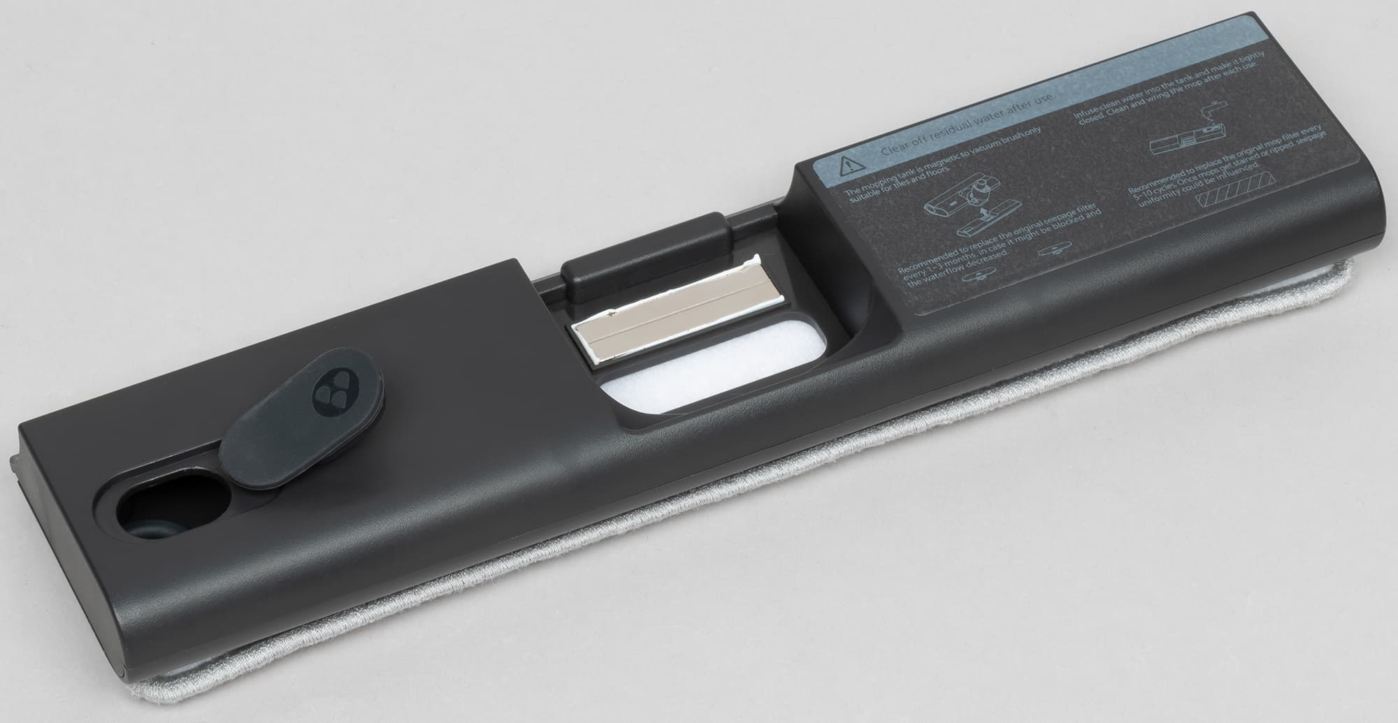 Еще одна прекрасная функция пылесоса Roidmi X20 — возможность влажной уборки. К задней части напольной насадки при помощи магнитов крепится насадка для мытья пола — бак для небольшого количества воды с тремя отверстиями. Верхнее предназначено для заливания воды и закрывается резиновой пробкой. Два нижних отверстия — для увлажнения моющей пол тряпки. Они закрыты несложными клапанами, подающими воду по каплям.