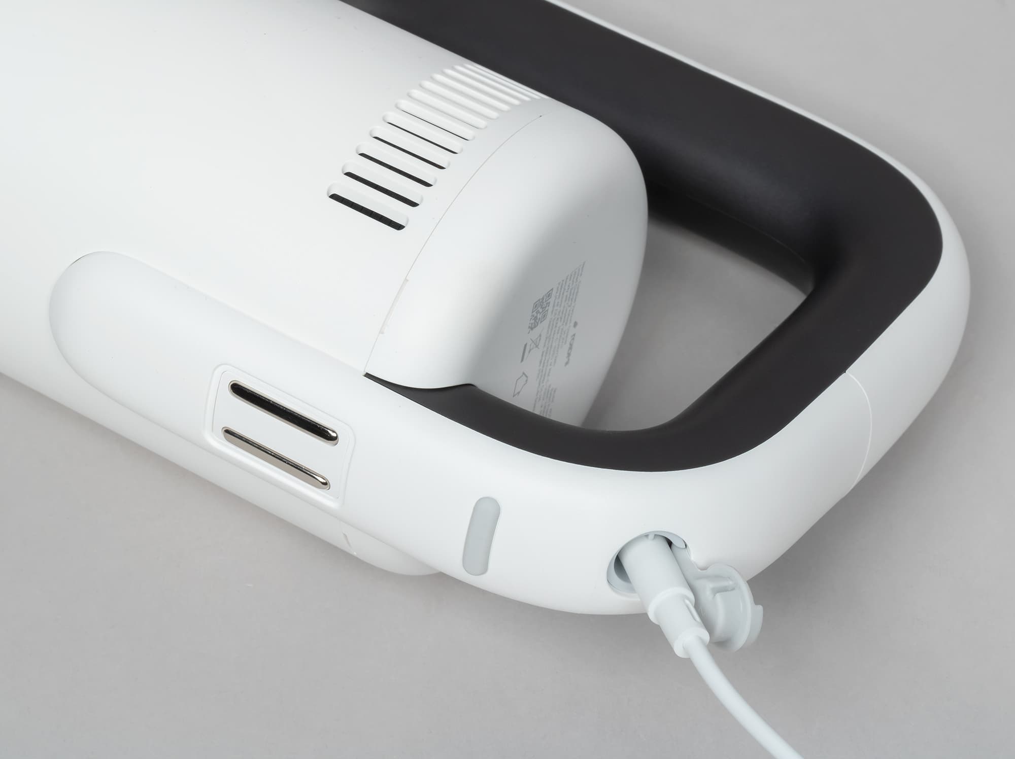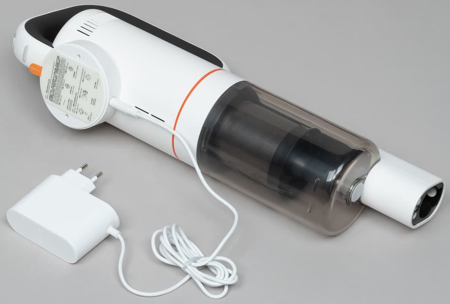 На нижней стороне рукоятки находится гнездо для подключения адаптера питания, закрытое резиновой крышкой. Там же мы обнаружили два металлических контакта для беспроводной зарядки. Между ними расположен небольшой резиновый демпфер, защищающий пылесос от повреждений при постановке на беспроводную зарядку или при контакте со стенами и мебелью.