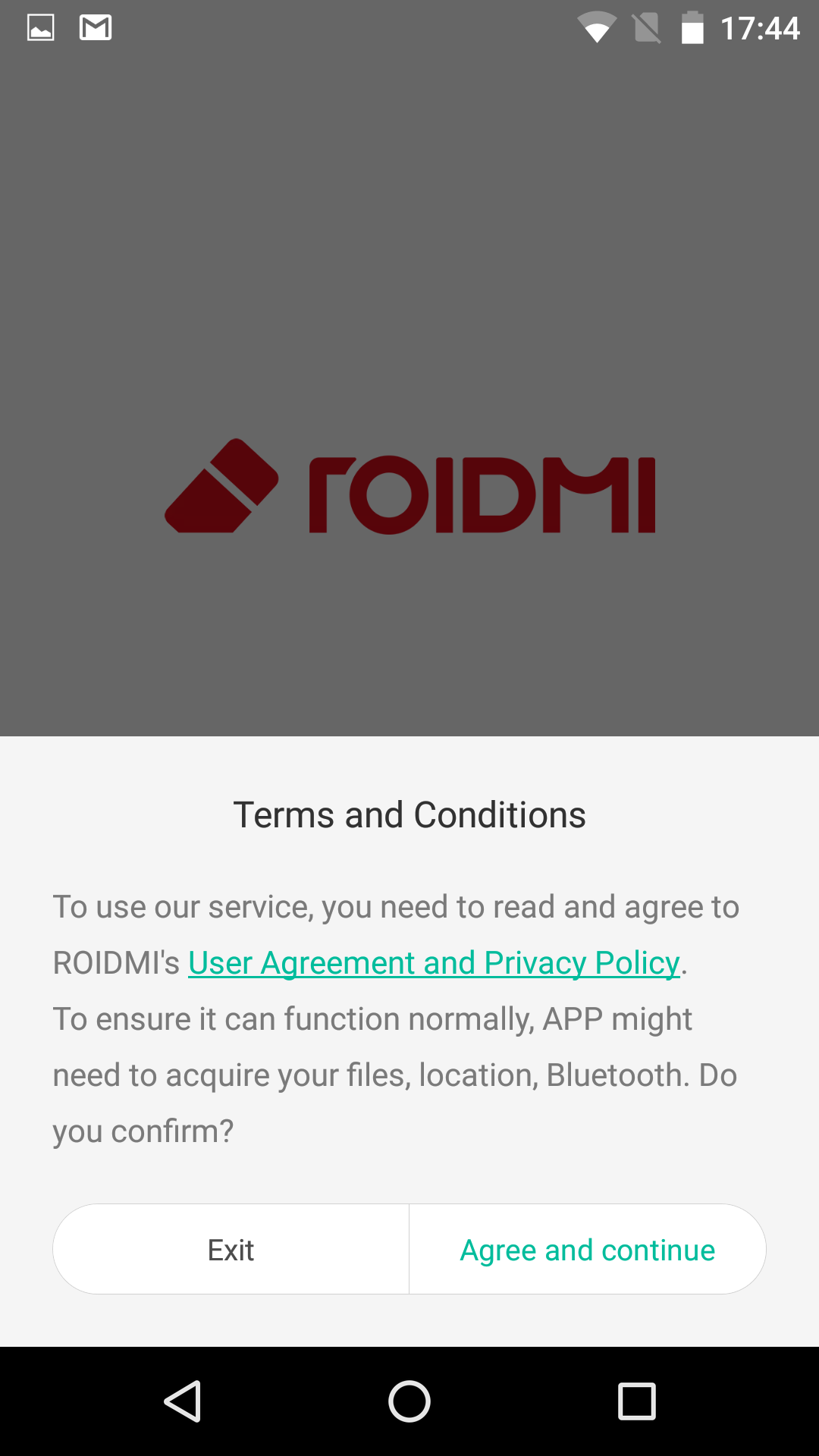 При первом запуске приложение запросило информацию о стране использования, права на доступ к файловой системе смартфона, а также подтвержденный почтовый адрес пользователя — без этого дальнейшее использование приложения невозможно.