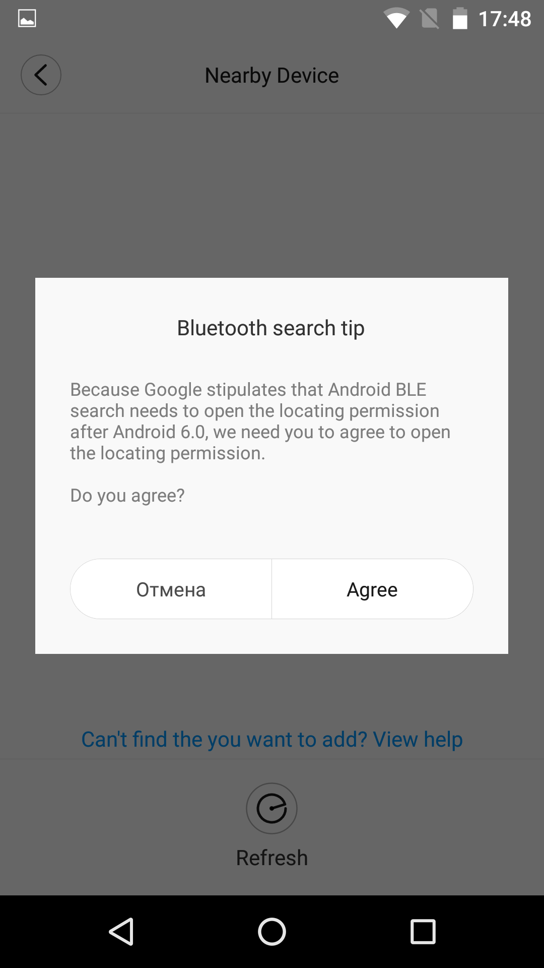 Получив письмо с проверочным кодом, мы ввели его в приложение и получили возможность включить Bluetooth и начать поиск устройства. Вопреки отзывам в Google Play, пылесос нашелся без проблем.