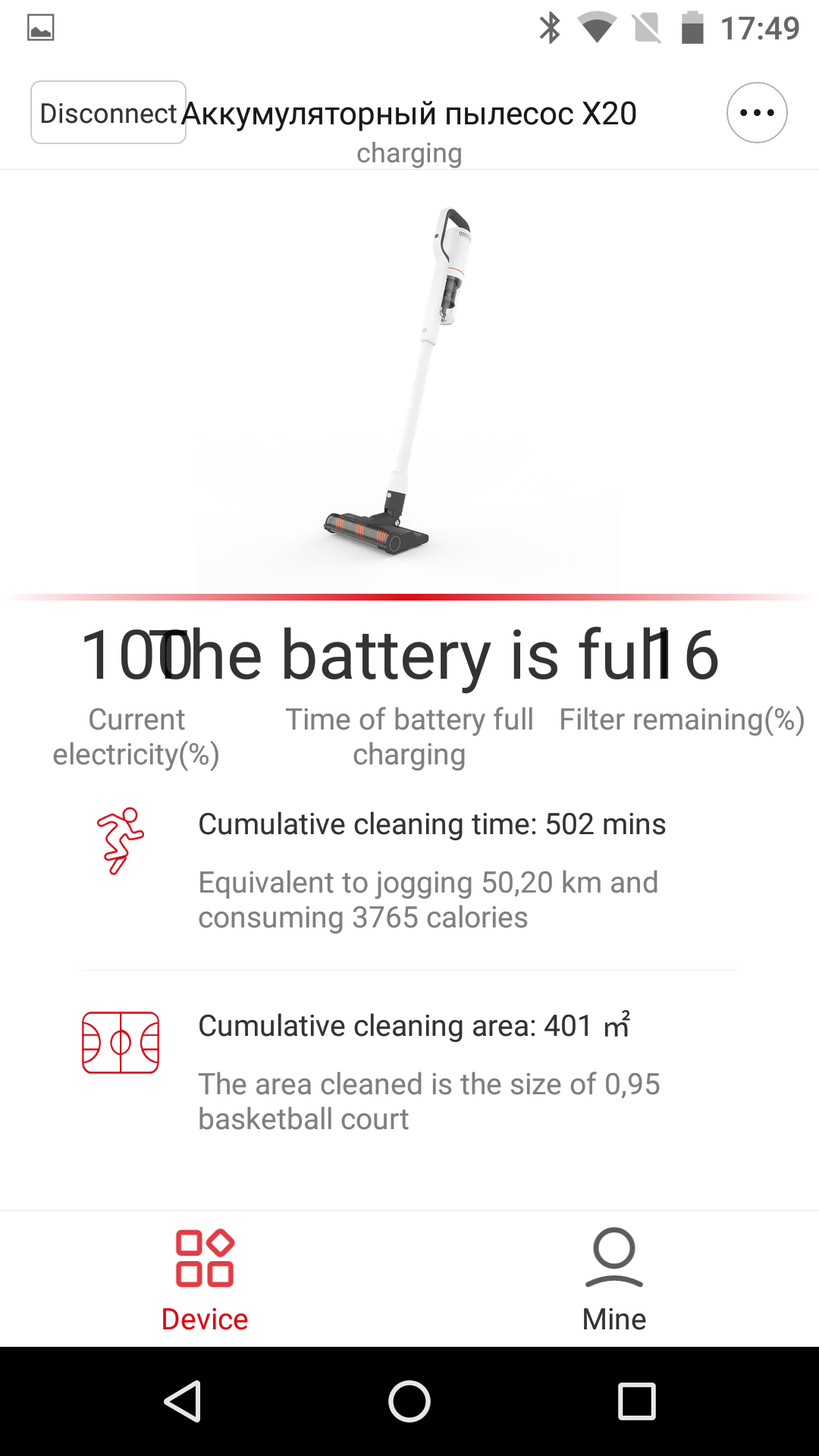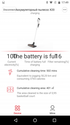 Пылесос, стоящий на зарядке, определяется как «Аккумуляторный пылесос X20». Приложение видит состояние батареи и рассказывает нам о суммарном времени пробега устройства — в минутах, потраченных калориях и убранной площади: наш пылесос уже успел убрать целое баскетбольное поле.