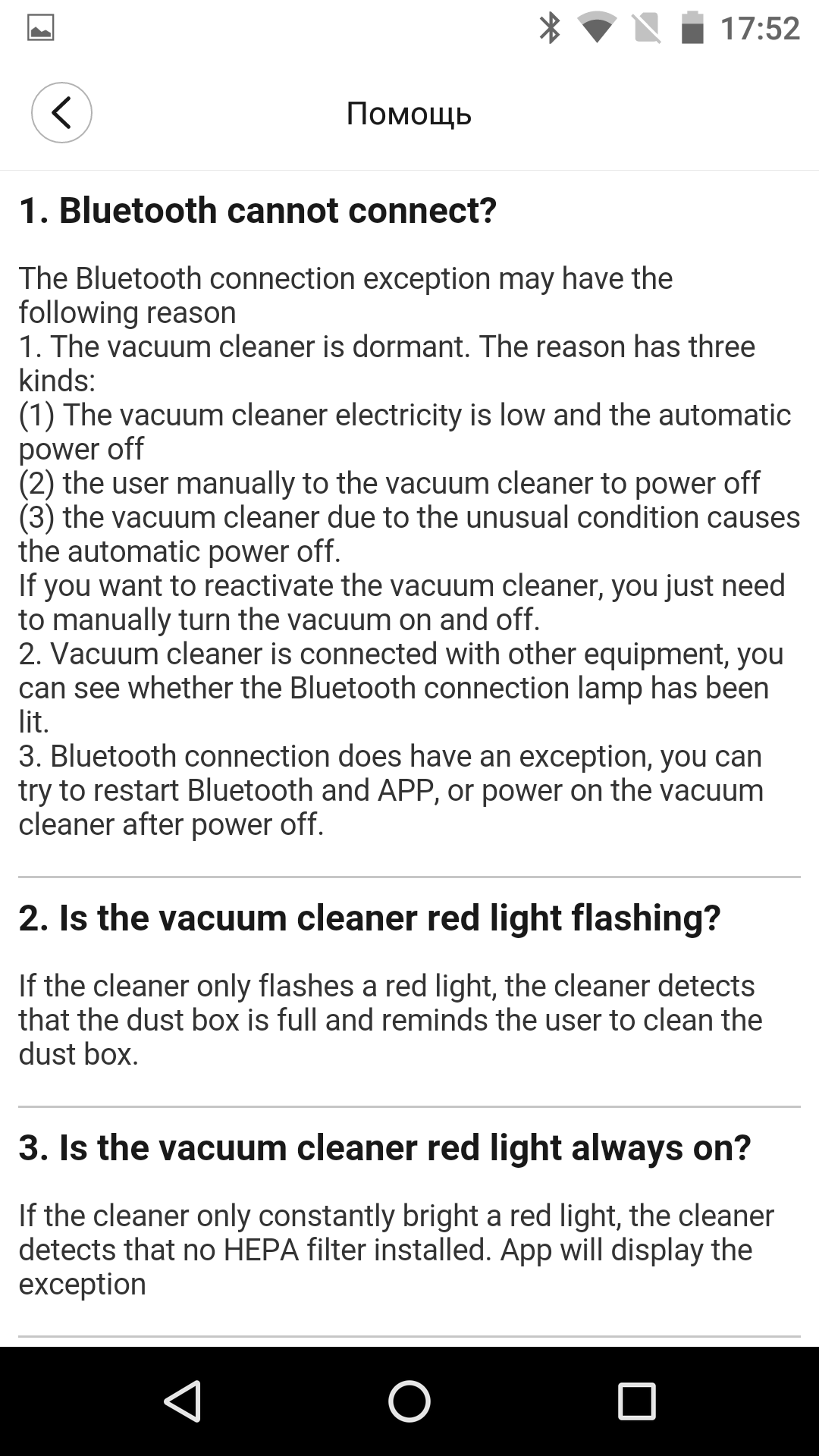 Инструкция устроена логично: начинается с распаковки пылесоса и прикрепления к стене гнезда для его парковки, затем вскользь сообщает о переключении скоростей и использовании разных насадок. Более внимательно автор документа отнесся к установке приложения для дистанционного контроля пылесоса. И особо подробно описано, как чистить устройство. Приведена также таблица неисправностей, которые можно устранить в домашних условиях.