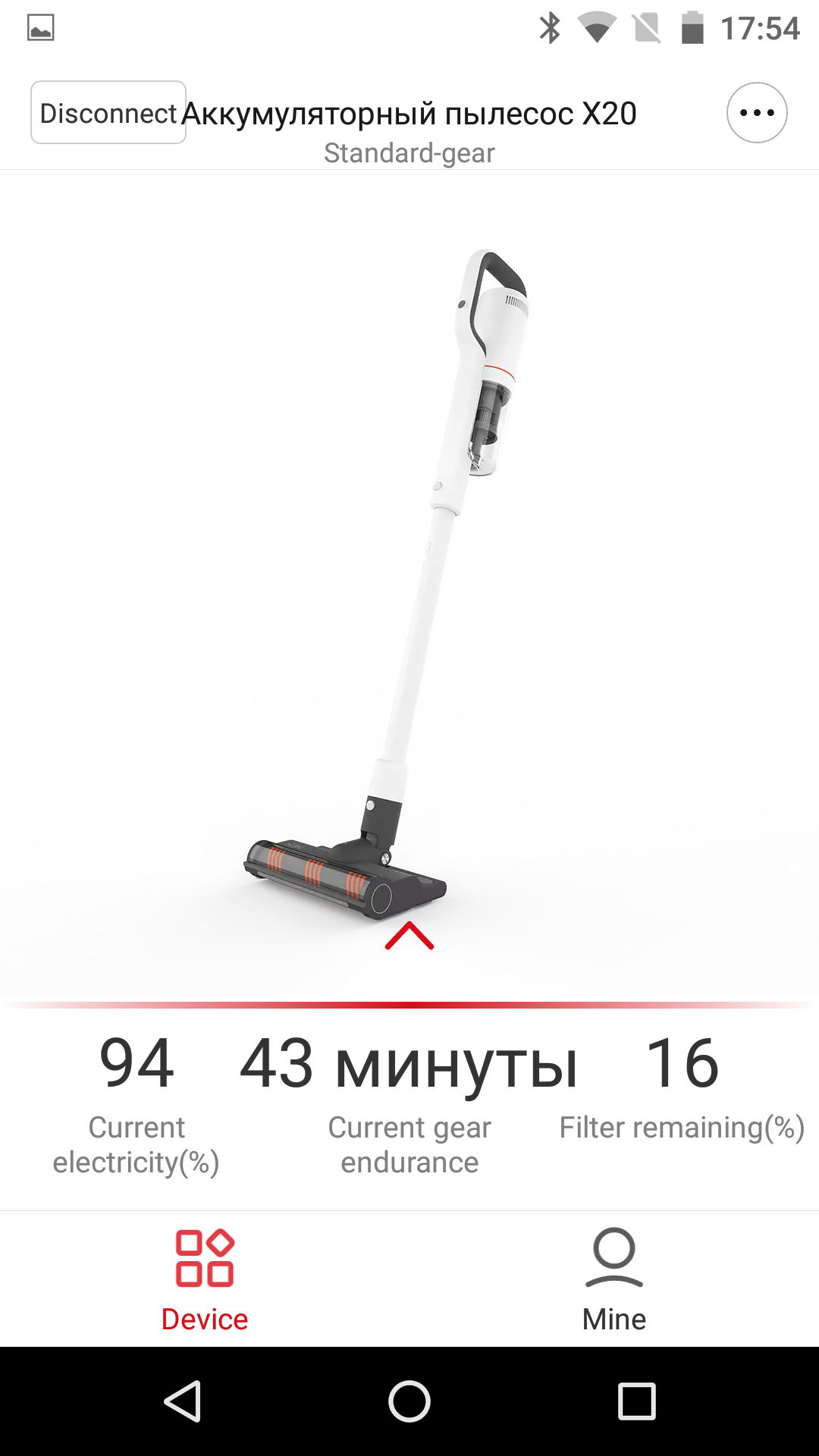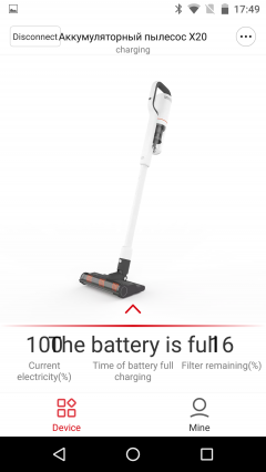 Информация о работающем пылесосе несколько полезнее: приложение показывает данные о текущем режиме и делает прогноз о времени работы (как показала эксплуатация — вполне точный). Также доступна информация о состоянии фильтра.