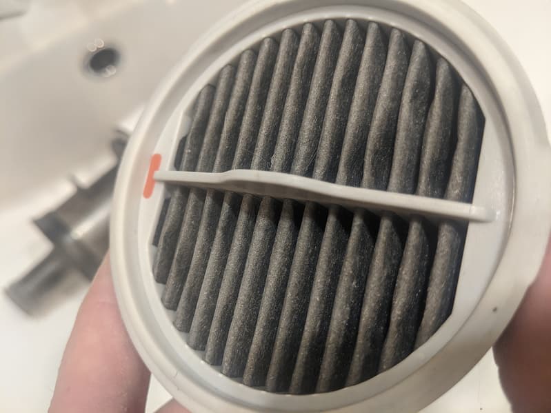 В задней части моторного блока расположена крышка выпускного фильтра. Под ней скрывается подковообразный фильтр любопытной конструкции: его внутренняя, обращенная против потока воздуха сторона выполнена из «гармошки» HEPA-фильтра, а наружная представляет собой весьма тонкую силиконовую полоску с продольными надрезами, которые работают как клапаны, не препятствуя потоку воздуха изнутри, но не впуская пыль снаружи, из выпускных решеток.