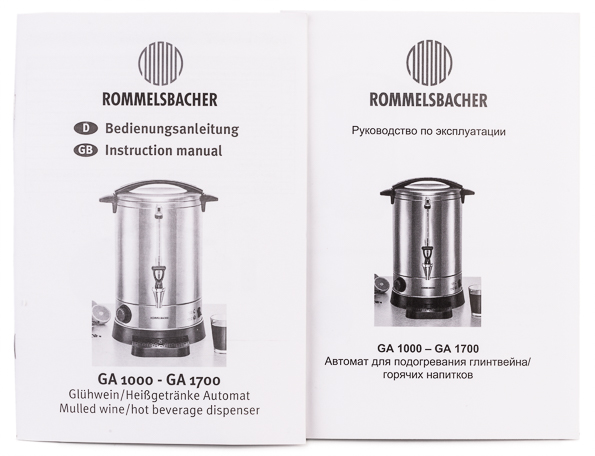 Руководство по эксплуатации у моделей GA 1000 и GA 1700 общее, т. к. с точки зрения использования они ничем кроме объема бака не отличаются. Как и у почти всей немецкой техники, наибольшее внимание уделяется вопросам безопасности — производить приборы немцы еще могут доверить китайцам, но вот инструкции для них явно пишут сами. Впрочем, количество органов управления у Rommelsbacher GA 1000 невелико, а их назначение очевидно, так что если не хотите узнать оптимальную температуру глинтвейна, то можно инструкцию вообще не читать.