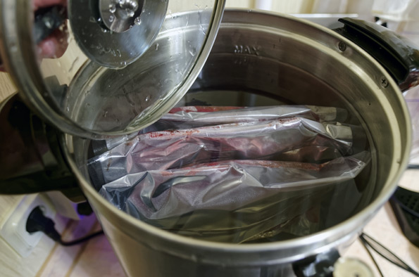 Первые 2 пакета были извлечены через 3 часа после достижения заданной температуры. Последний был оставлен в нашем импровизированном су-виде на всю ночь. Тут же обнаружилось первое неудобство в использовании GA 1000 в качестве су-вида: таймера у устройства нет, поэтому пришлось пользоваться внешним (на смартфоне).