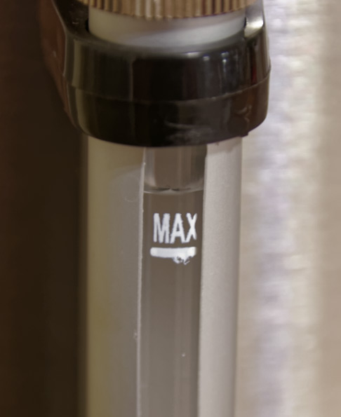 В дальнейшем уровень воды в баке не должен превышать отметку «Max». Здесь мы столкнулись с первой небольшой странностью: отметка на внутренней стороне бака оказалась не очень хорошо «синхронизирована» с отметкой на водомерной трубке: если наливать воду по отметке на стенке бака, то трубка покажет нам небольшой перелив.