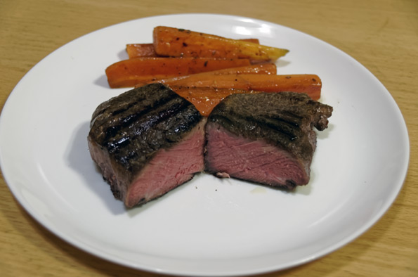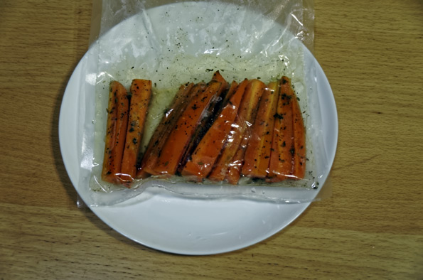 На второй день (уж экспериментировать — так экспериментировать!) было решено в качестве гарнира к стейкам приготовить морковь су-вид — 2 часа при температуре 85 °C. Здесь нас тоже не ждало ничего неожиданного.
