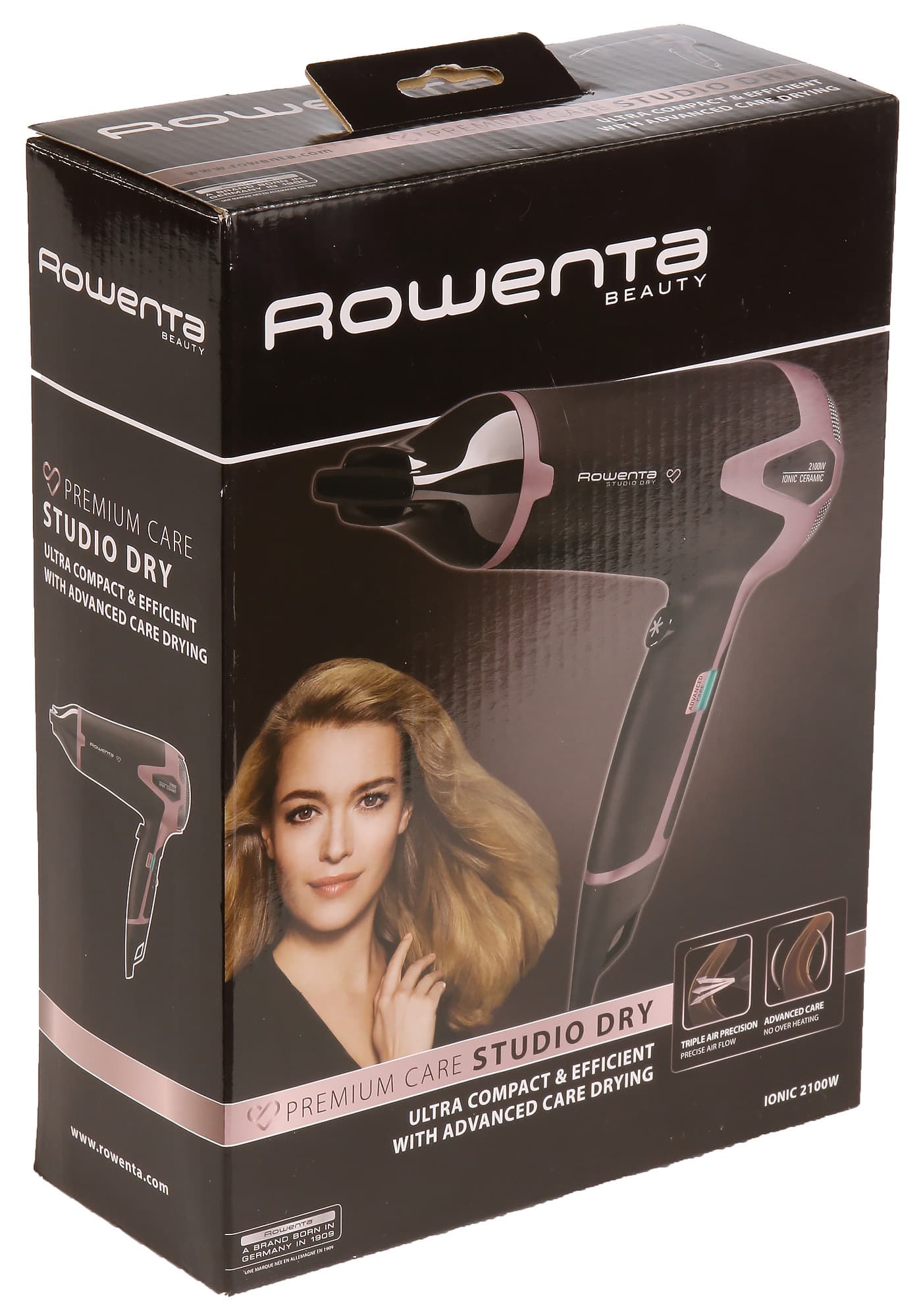 В развитии темы ухода за волосами с помощью достижений современной науки и техники нам сегодня поможет фен известной фирмы Rowenta. На коробке и самом приборе размещено сразу несколько названий, поэтому полный титул данной модели мог бы звучать как Premium Care Studio Dry Ionic Ceramic 2100 W CV5361. Короли прошлого и настоящего могут завидовать, а мы приступаем к тестированию и заодно расшифровке титула.