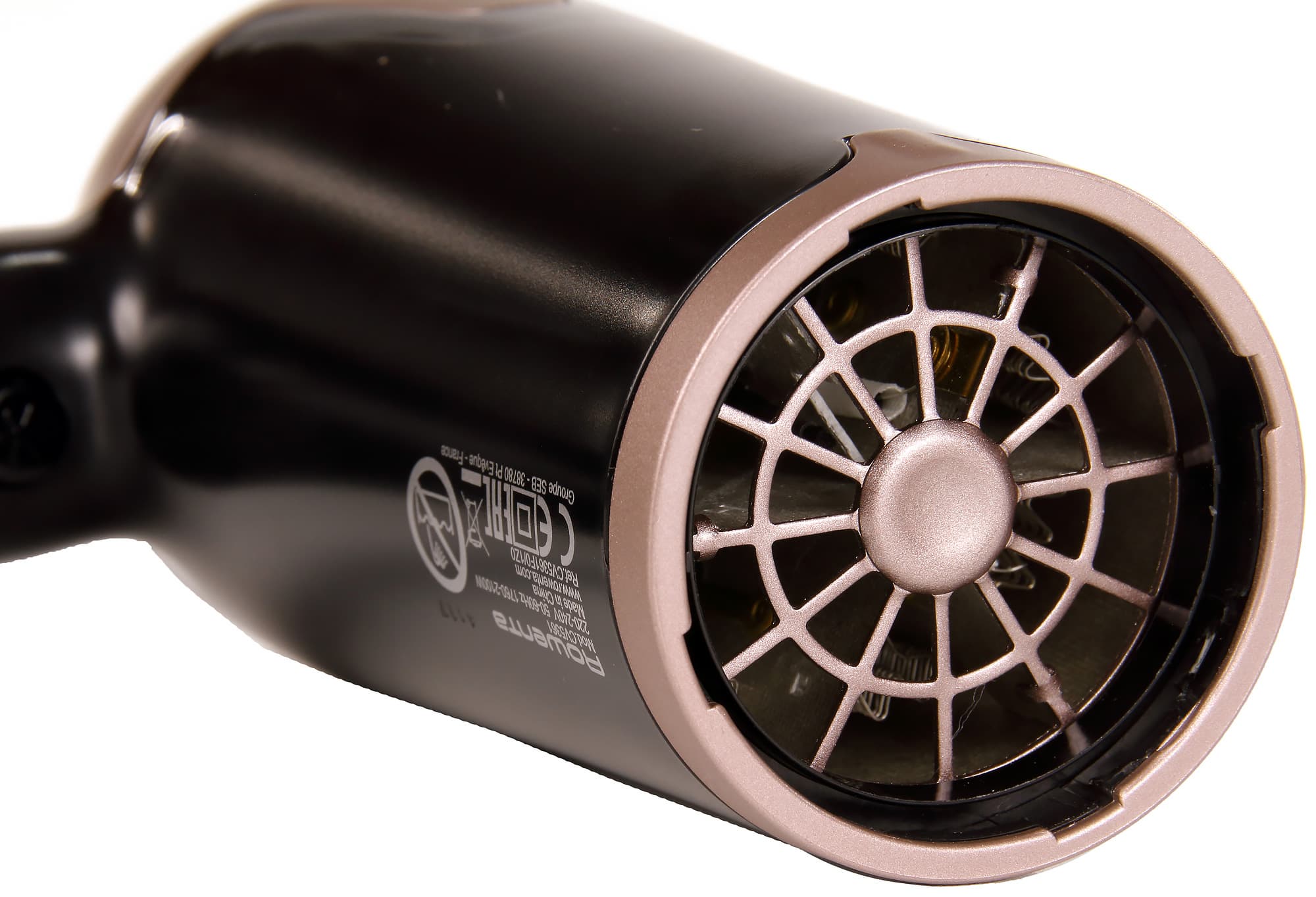 Фен Rowenta выглядит как типичный представитель своей категории, разве что его размеры и вес ощутимо меньше, чем у моделей с аналогичной мощностью. Корпус из матового черного пластика украшен вставками пепельно-розового цвета, по-девчачьи, но не режет глаз. Ручка стандартной длины оканчивается резиновым кожухом в месте крепления шнура электропитания, там же находится петля для подвешивания фена. Черный провод длиной 1,8 метра имеет обычную толщину и не стремится запутаться. Сбоку по корпусу указаны все наименования модели, которые мы прокомментировали выше.