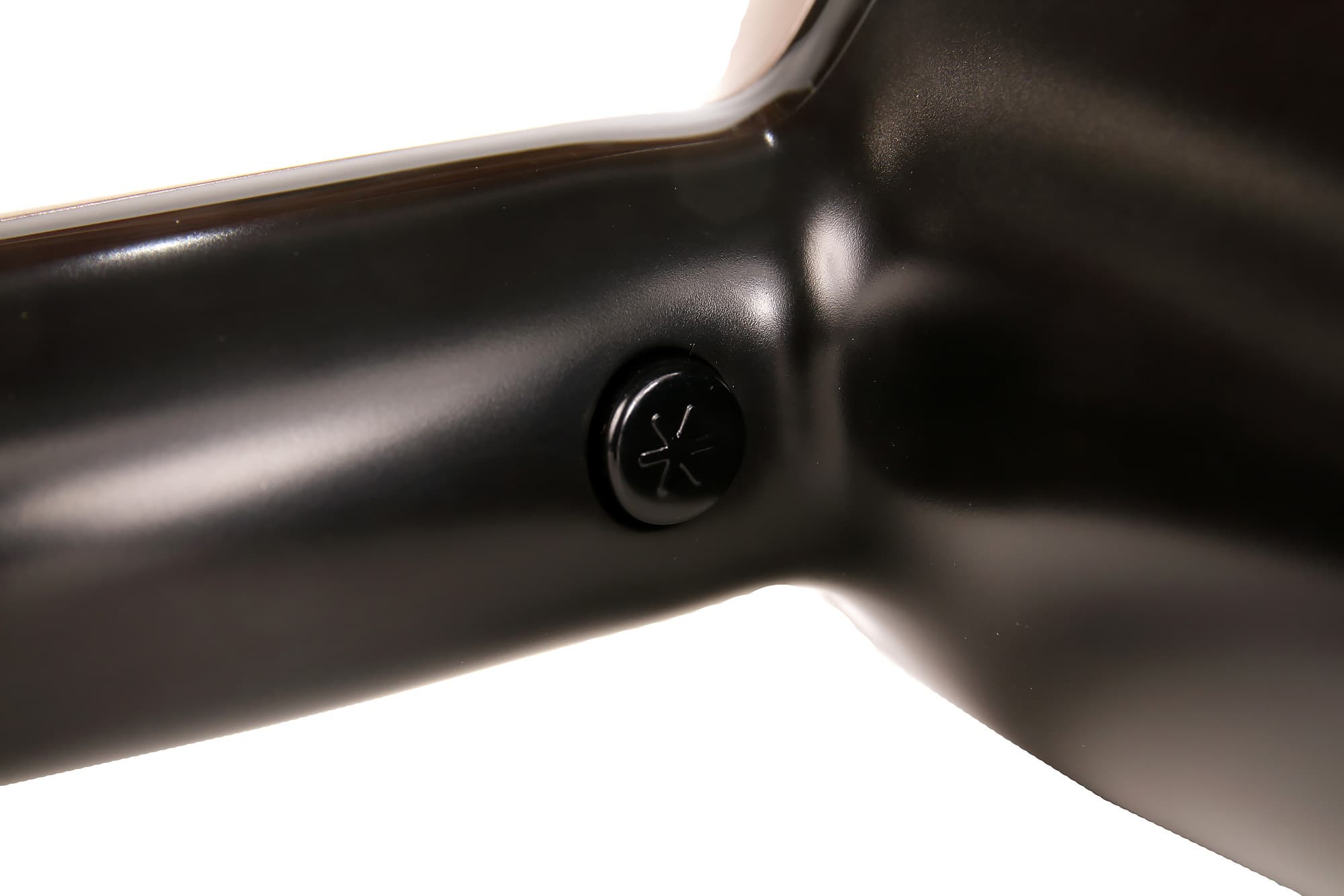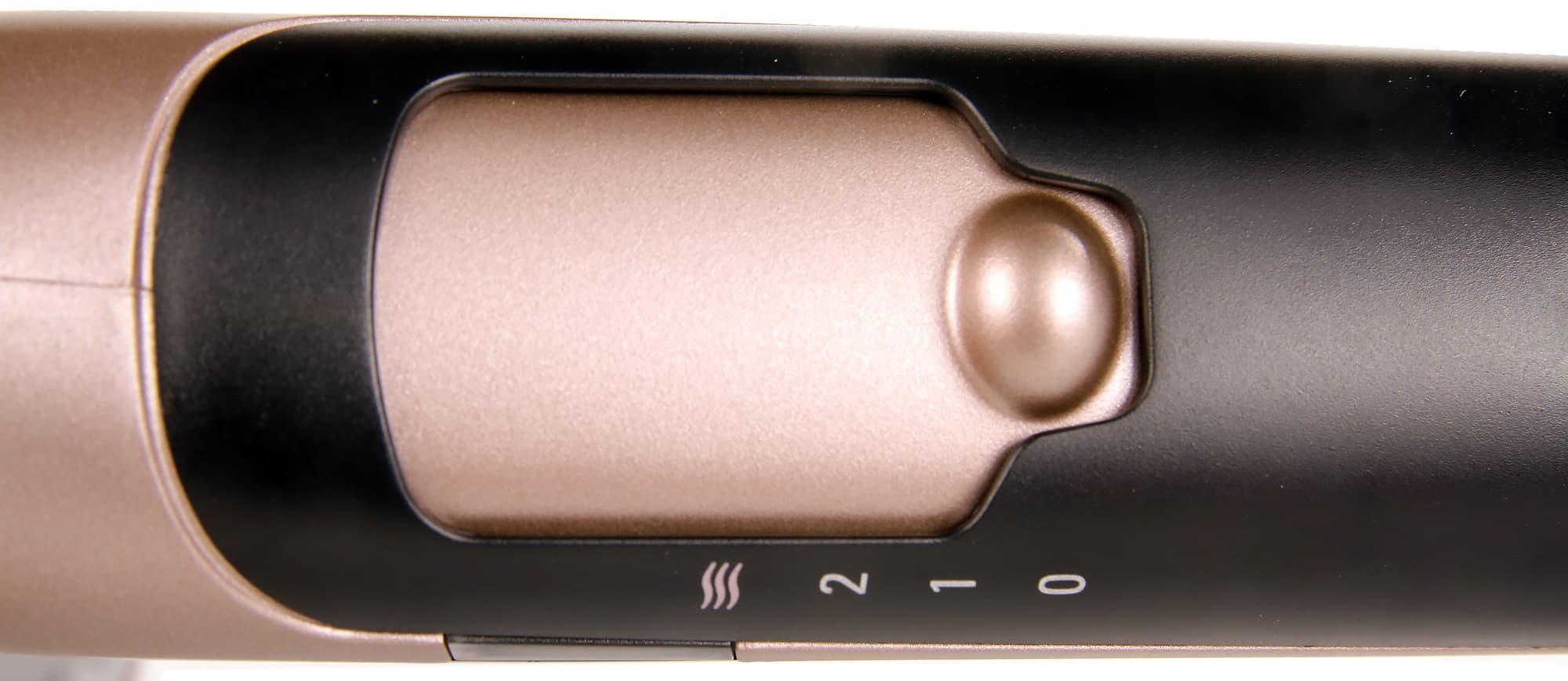 На ручке из того же гладкого пластика спереди находится незаметная черная кнопка включения функции «холодный воздух». Она расположена близко к корпусу, чтобы держать ее нажатой указательным пальцем.