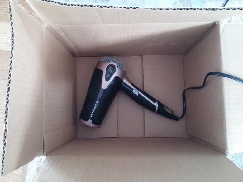 Тест на наличие защиты от перегрева был произведен при помощи картонной коробки размерами 30×22×23 см, в которой был закрыт фен и включен максимально энергоемкий режим работы. Всего через 14 секунд фен самопроизвольно выключился. Картон успел нагреться незначительно, а вот корпус фена был ощутимо теплым. Особенных запахов ни прибор, ни картон издать не успели, но при включении спустя 5 минут был след запаха нагретого пластика. Таким образом, защита от перегрева присутствует и работает с солидным запасом.