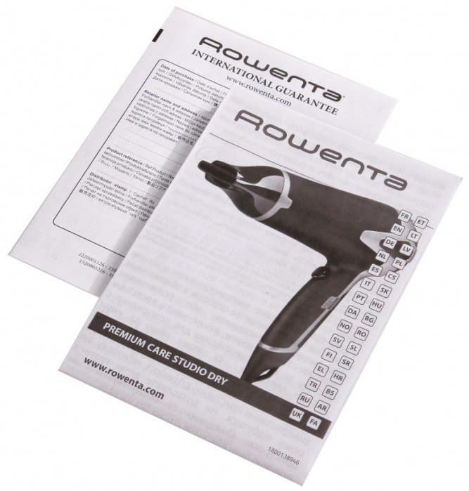В коробке мы обнаружили крупный буклет многоязычной инструкции и упакованные в полиэтилен фен и насадку, а также сертификат соответствия и международную гарантию.