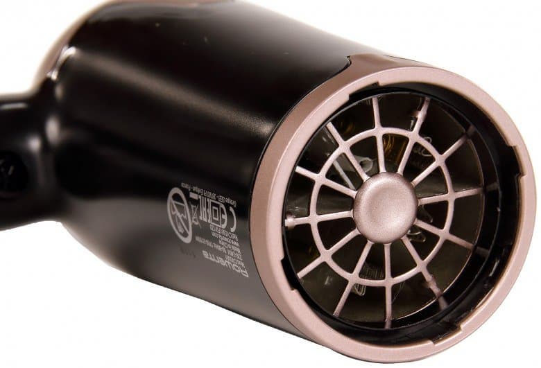 Сзади вентилятор защищен серебристой ячеистой сеткой в один слой. Обращаем внимание на один слой защиты, так как во время тестирования волосы длиной ниже плеч дважды попали через сетку на лопасти (без катастрофических последствий).