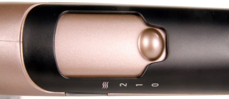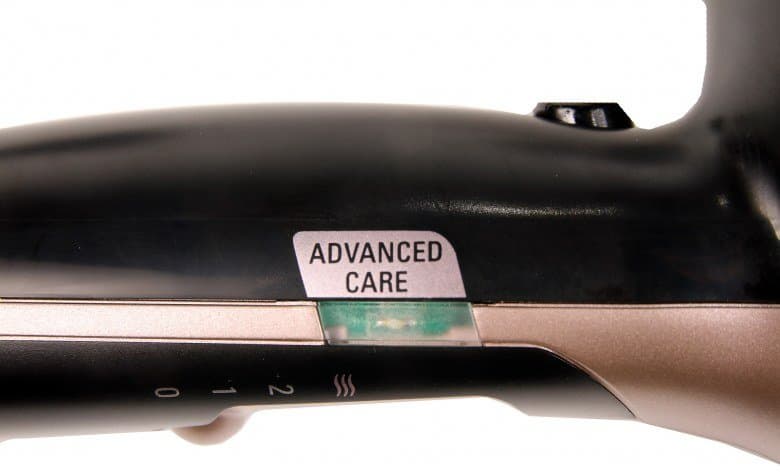 С обратной стороны ручки находится механический переключатель режимов, обозначенных цифрами 0, 1, 2 и значком волн. При переводе рычага в верхнее положение напротив значка с волнистыми линиями рядом в специальном окошке загорается зеленый индикатор с подписью Advanced Care. Он означает оптимальный температурный режим для сушки волос по мнению производителя.