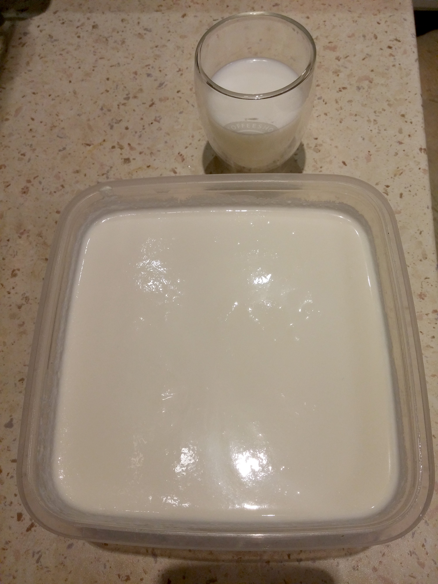 К счастью, исходные продукты были охлаждены, поэтому за первый час они успели нагреться лишь до 55 °C (хвала пирометру!) и мы экстренно перевели нашу смесь в номер люкс в мультиварке на 40 °C на оставшиеся 7 часов, добавив еще ложку сметаны и 50 г йогурта как компенсацию перегретой закваски.