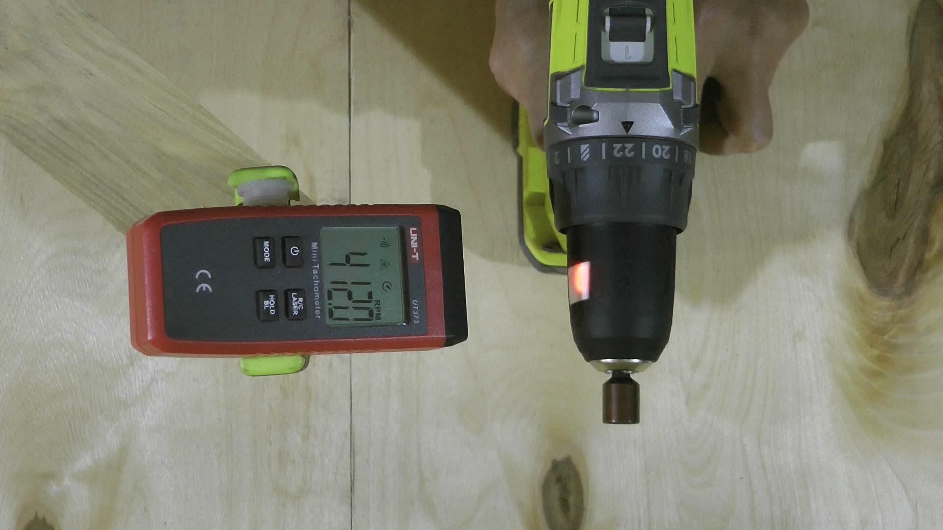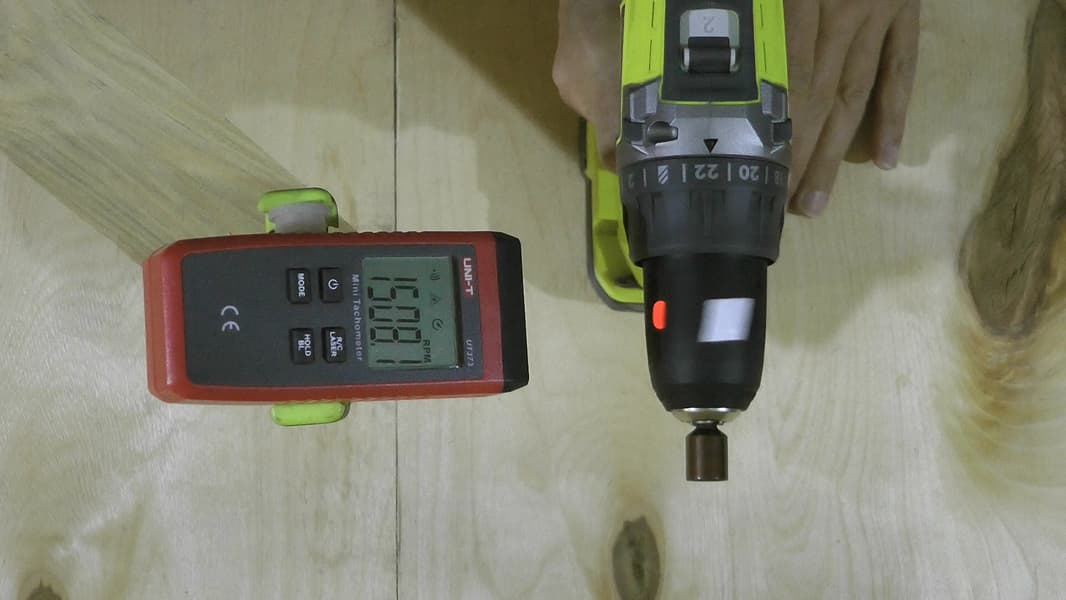 С помощью лазерного тахометра мы измерили скорость вращения патрона в первом и втором диапазонах скоростей. Оказалось, что в первом диапазоне шуруповерт дает 412 фактических об/мин, а во втором — 1508 об/мин при заявленных 500 и 1800.
