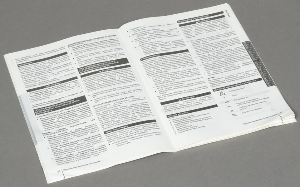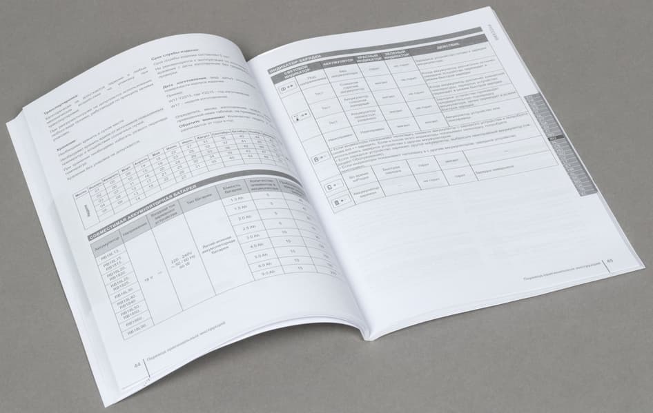 Шуруповерт и зарядное устройство сопровождаются отдельными бумажными руководствами. Толстенькие книжки содержат справочную информацию на 26 языках.