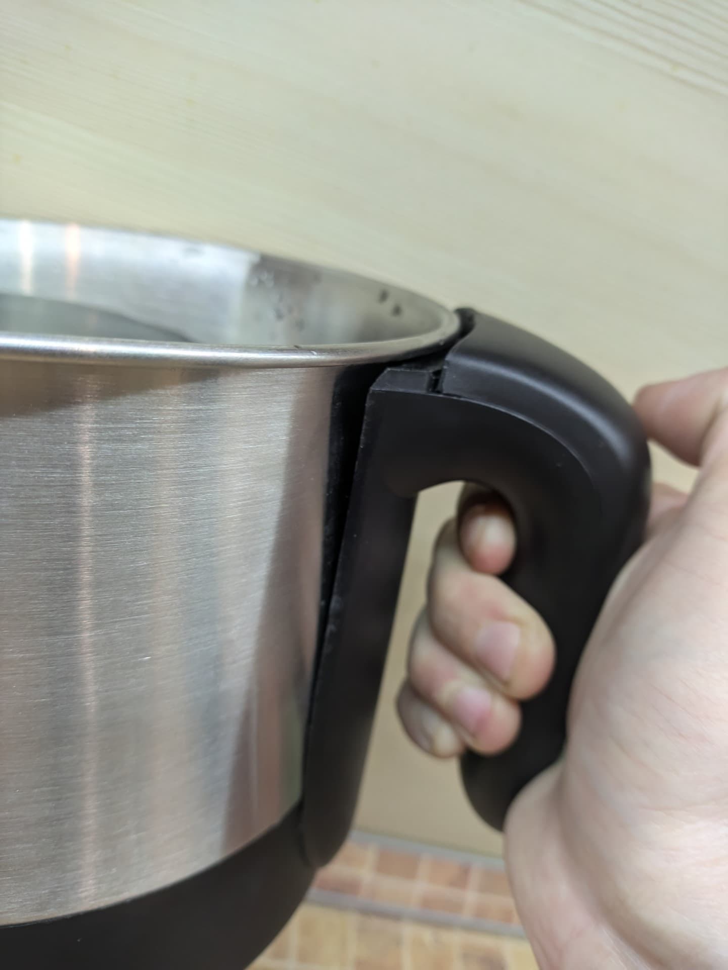 Сбоку крепится пластиковая ручка. Крепится, надо сказать, плоховато: у нашего экземпляра одно из двух креплений отвалилось, поэтому ручка хоть и выполняла свою функцию, но сильно отгибалась — и изрядно пугала нас перспективой пролить кипяток на себя.